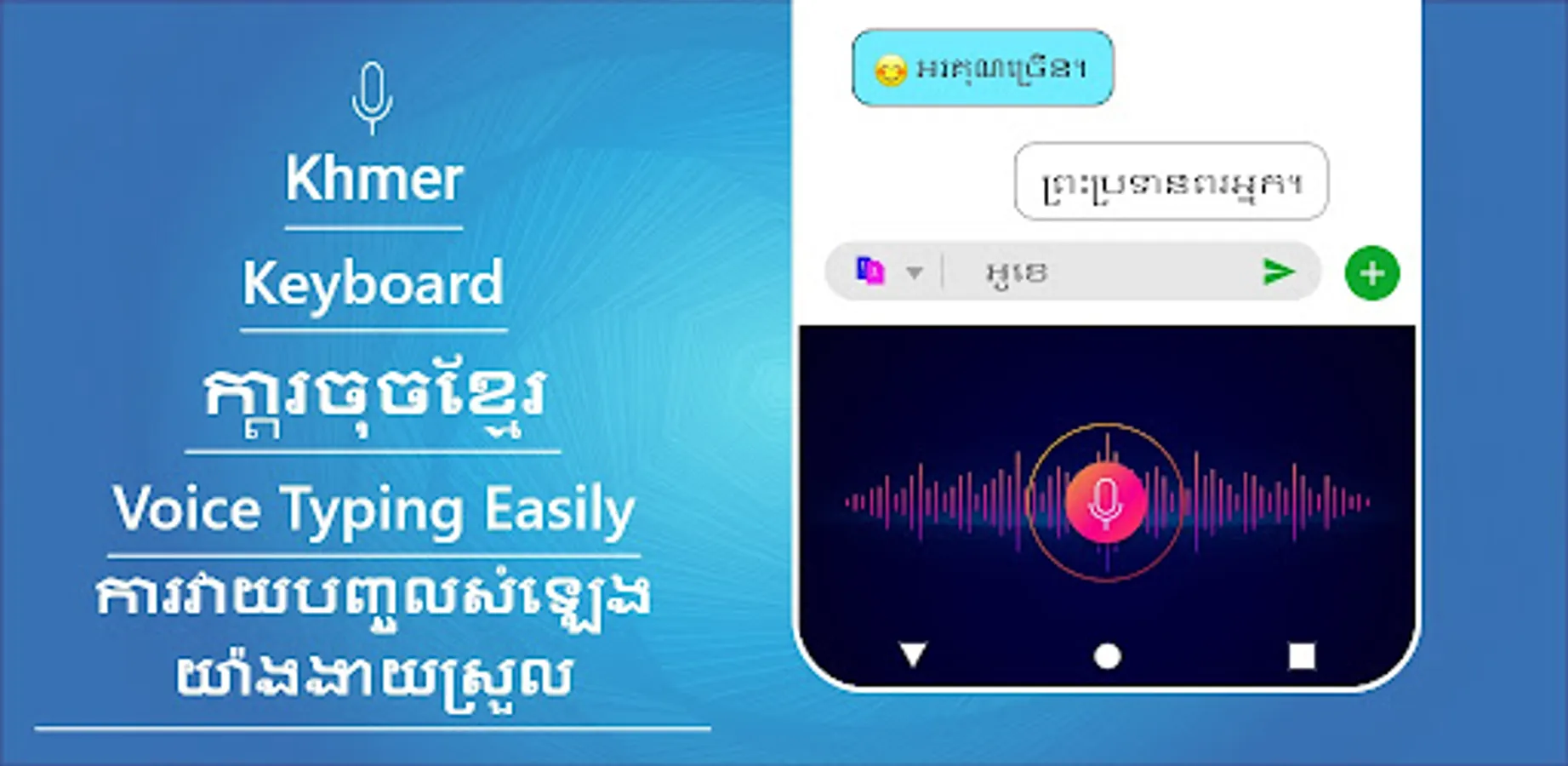 Easy Khmer Keyboard and Typing Khmer is unique Khmer language keyboard for Khmer learning, writing & chatting. Its autotext Cambodian language. English and Khmer keypad both works side by side. You can easily switch to Khmer Keyboard from English.