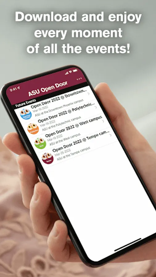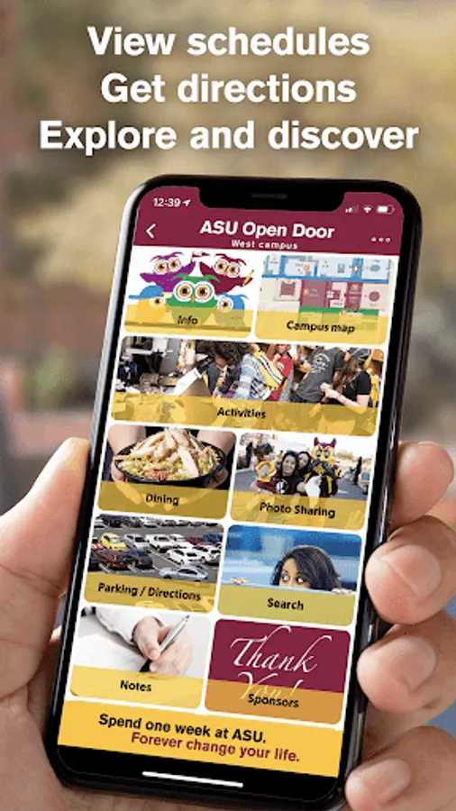 The ASU Open Door mobile app provides visitors with up-to-the-minute information, easy search for activities by interest areas, site maps, and more for each host campus.