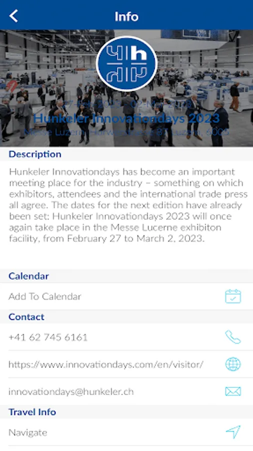 Optimize your visit to the Hunkeler Innovationdays with the the Hunkeler Innovationdays app. With our app, you can find all important information quickly and easily in one place before, during and after the trade fair. Thanks to the many functions, you can prepare for the event in the best way possible and concentrate on the things that are important to you during the show. Use this app and experience the Innovationdays digitally. All important information about Hunkeler Innovationdays 2023 is displayed in the app. The app offers information on Opening hours, directions, products, contacts, and much more. In addition, you will find the most important links to hotels, traffic and registration. The Hunkeler Innovationdays app is the comprehensive source of information for all questions about the event.