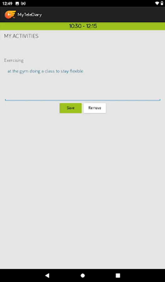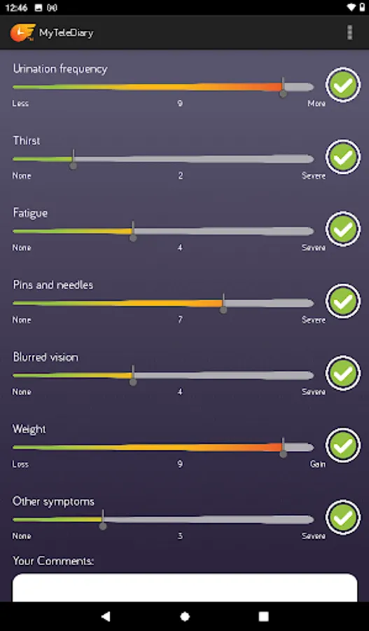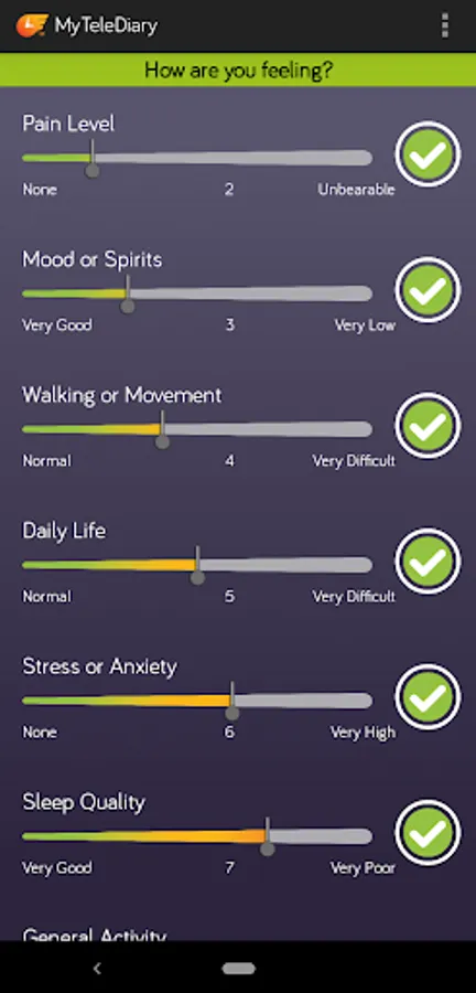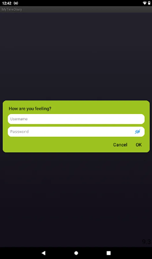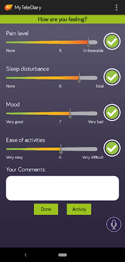 MyTeleDiary can only be used by account holders. This application is for use in a private study and not open for general use at present. From App end individuals can submit the feeling rating data in an easy way and expert can keep an eye from the web based dashboard. Expert can setup specific profiles for specific individuals and also can send queries via question answer dialogue boxes. Depending on data values expert also gets notified about criticality of the patient with an alarm at web end. It is 24X7 remote monitoring with ease of use and reliability.
