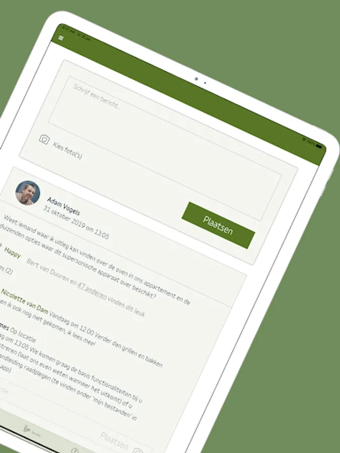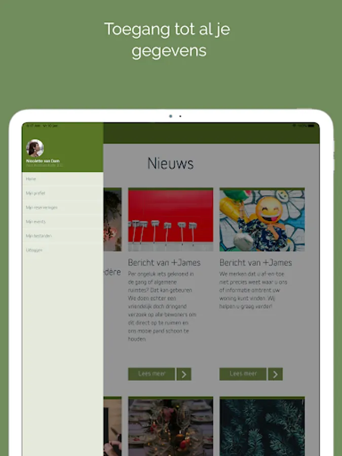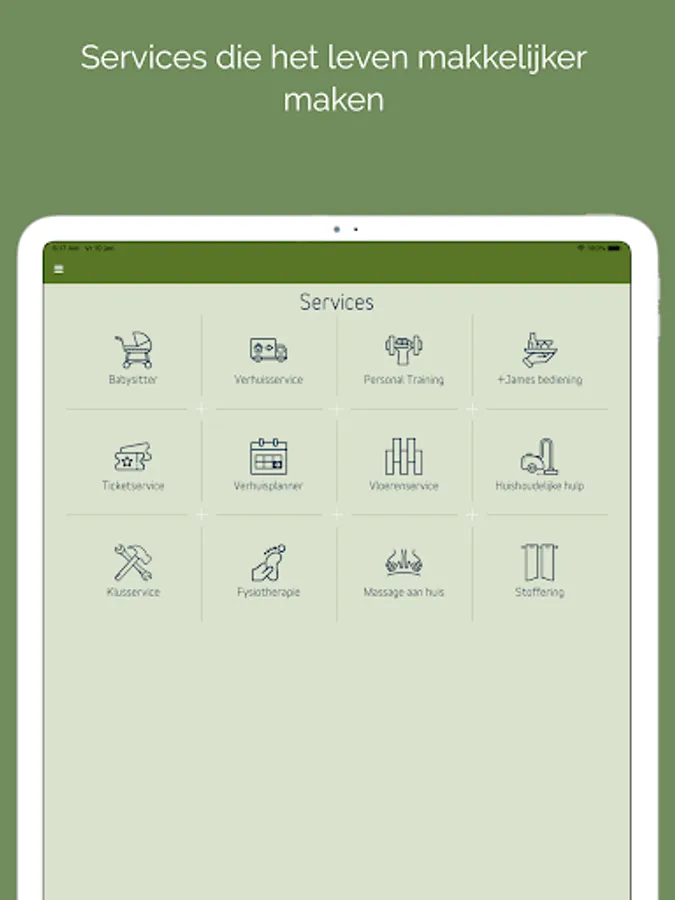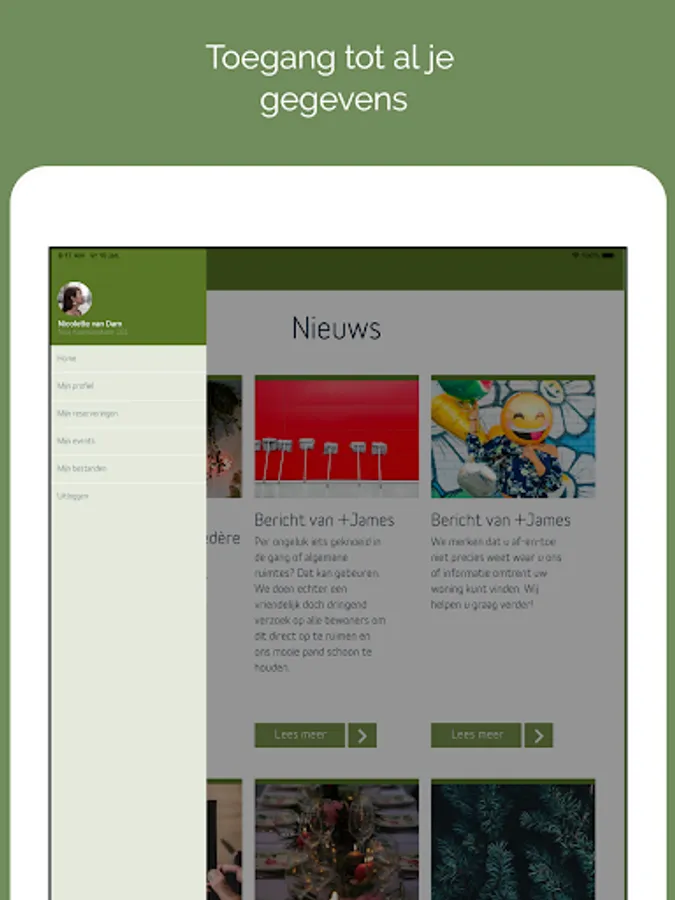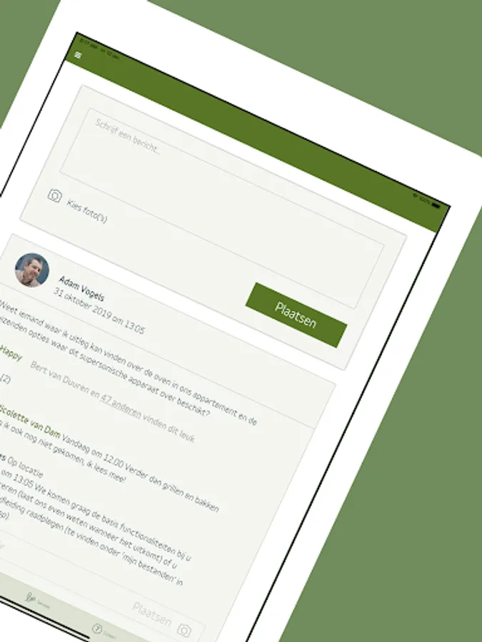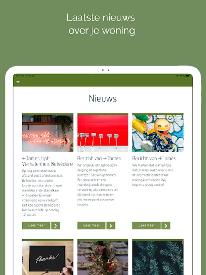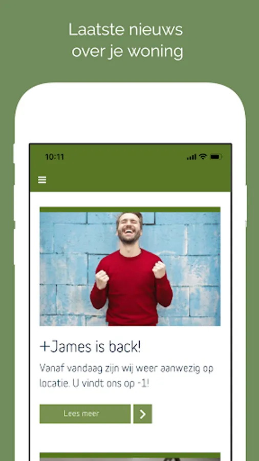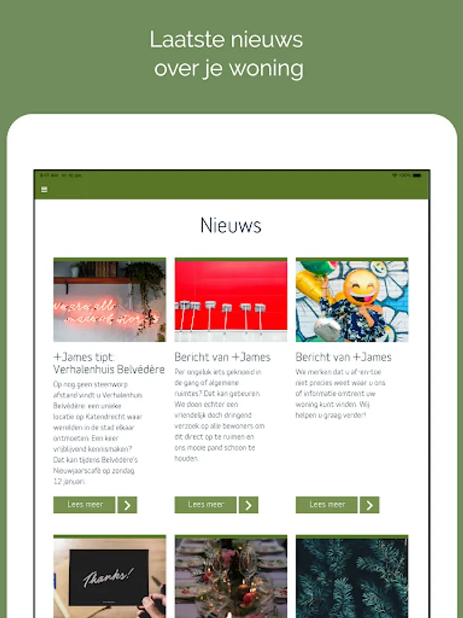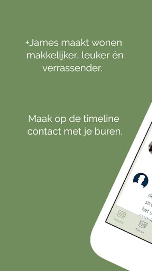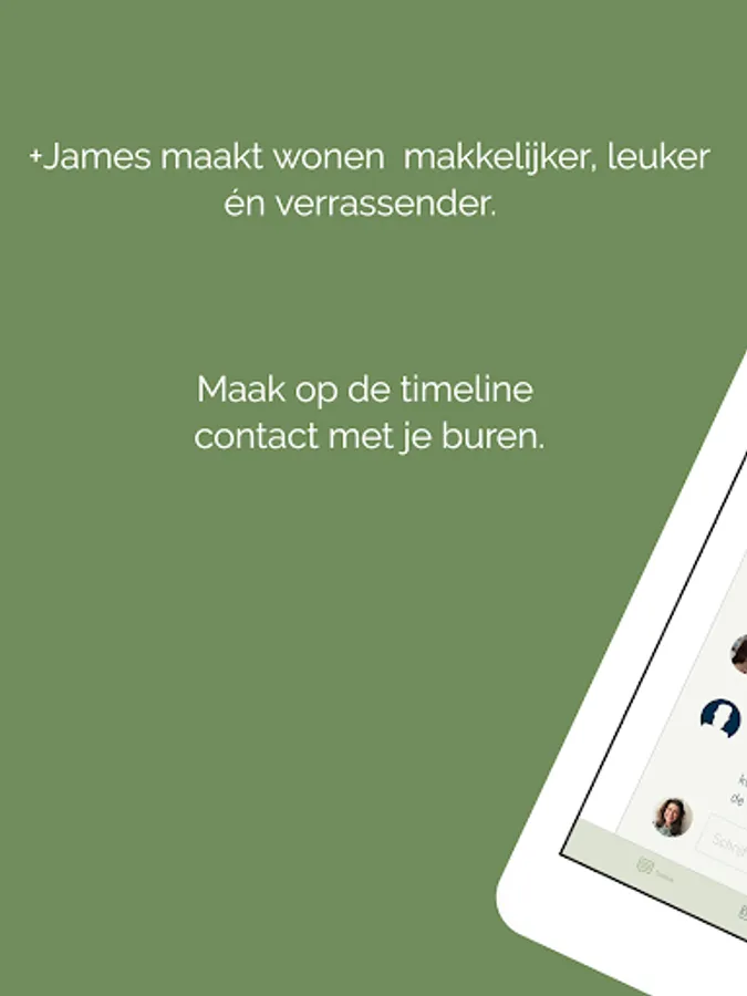 Do you live in a +James building? Then you can use the official +James app. In the app you can share messages with your fellow residents on the timeline and contact +James directly. In the app you can also read the latest news about your residential building and the surrounding area, you can use the services of +James and you will find up-to-date manuals about your home.