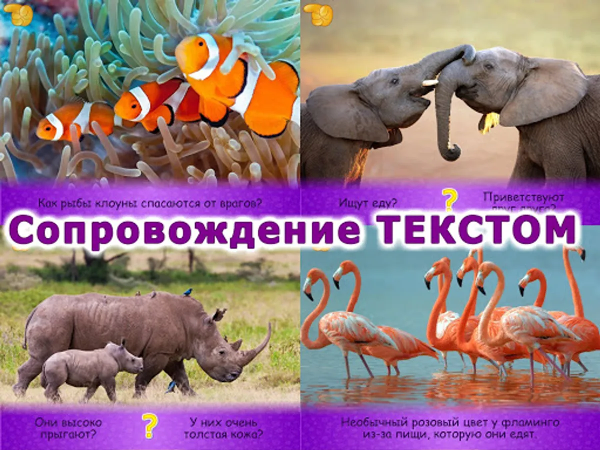100 colorful photos for children and toddlers and 300 voiced questions to them will help the child understand what types of animals exist! How interesting animals live, what they eat and what they are famous for!