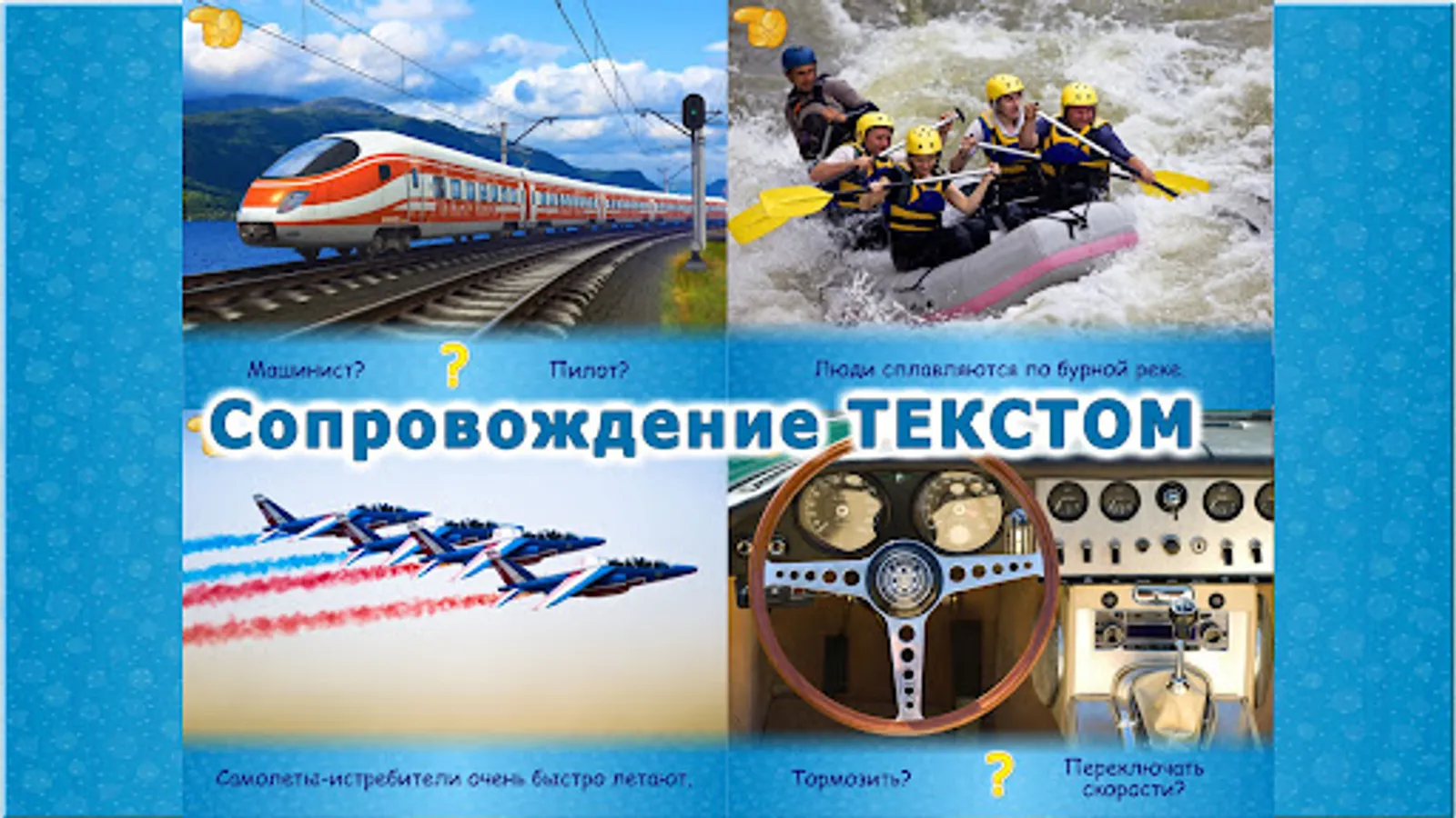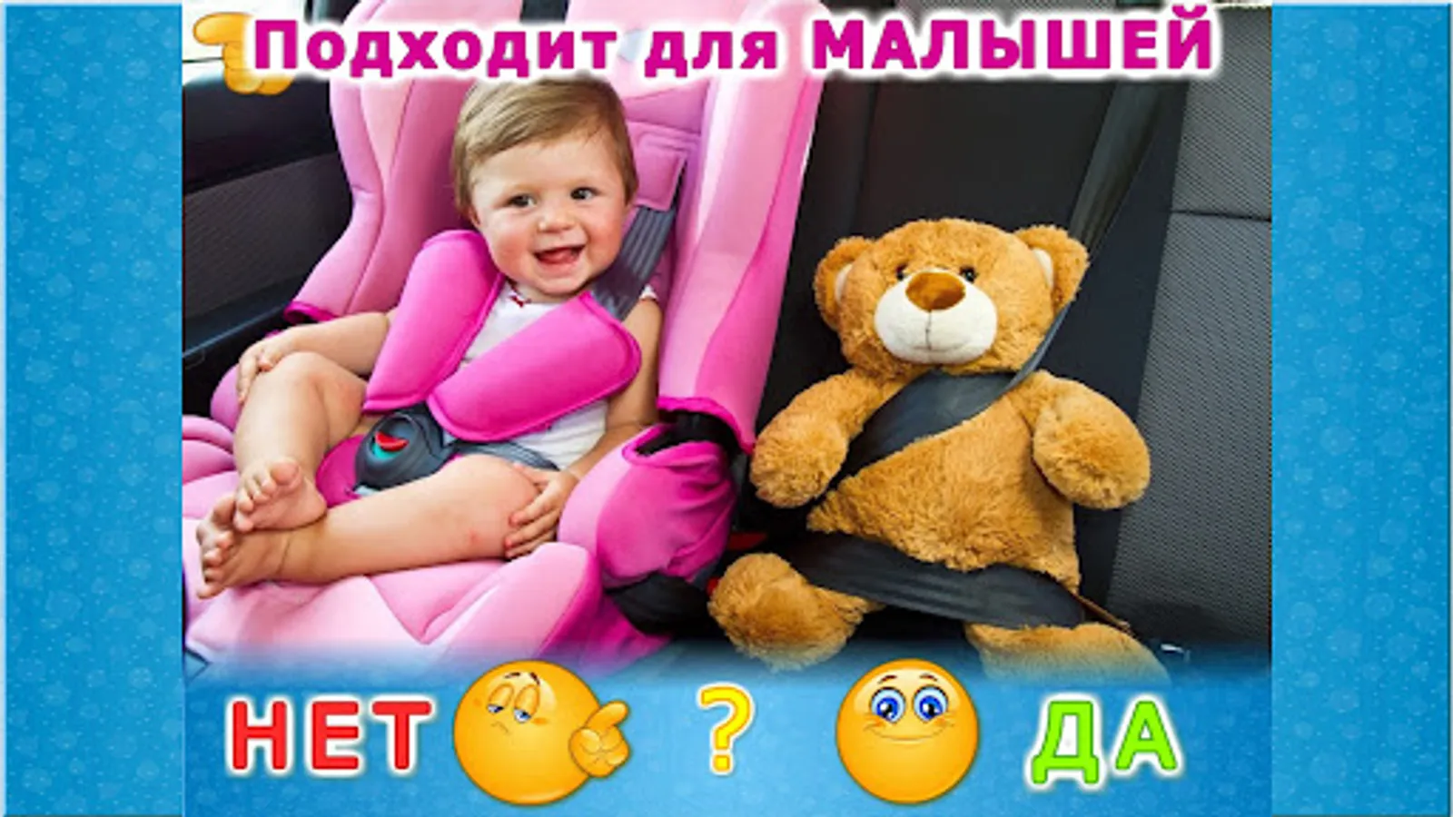 Приложение в легкой игровой форме показывает фотографии и задает вопросы. Ребенку нужно выбрать правильный ответ или согласиться с предложенным.
