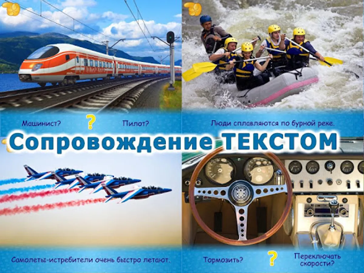 100 colorful photos and 300 voiced questions to them will help the child understand what types of transport exist! In "Kids Games: Transport for Kids" you will find many beautiful images that motivate your child to explore the world around them.