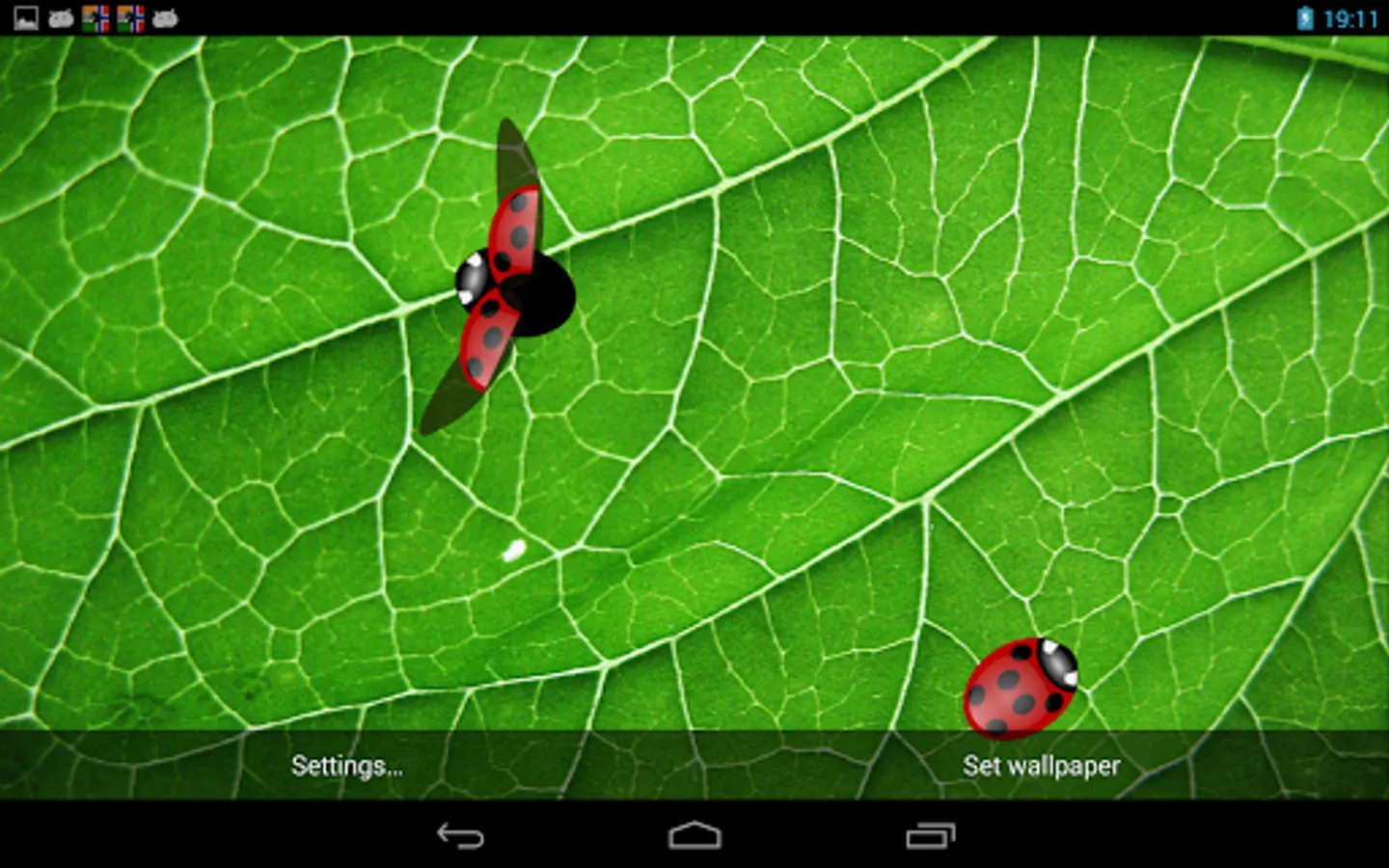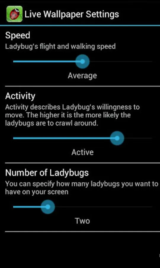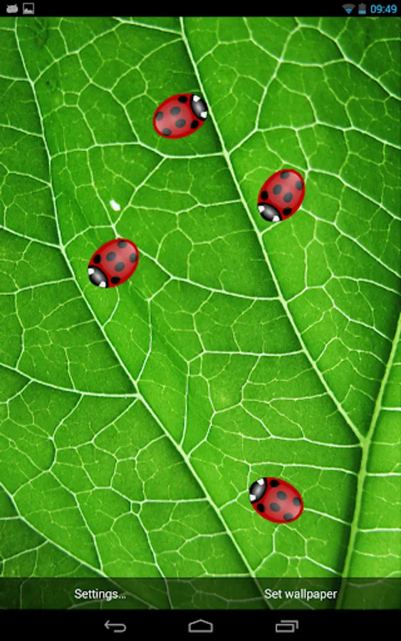 To use this ladybug live wallpaper: Home -> Menu -> Wallpaper -> Live Wallpaper -> Ladybug Live Wallpaper. Or second way: Home -> Long press -> Live Wallpapers