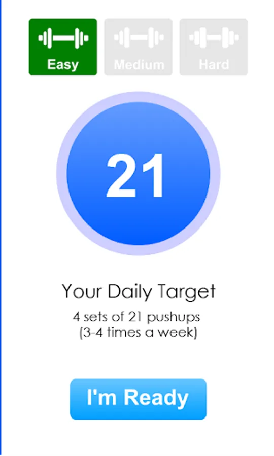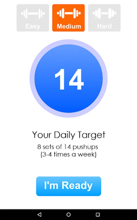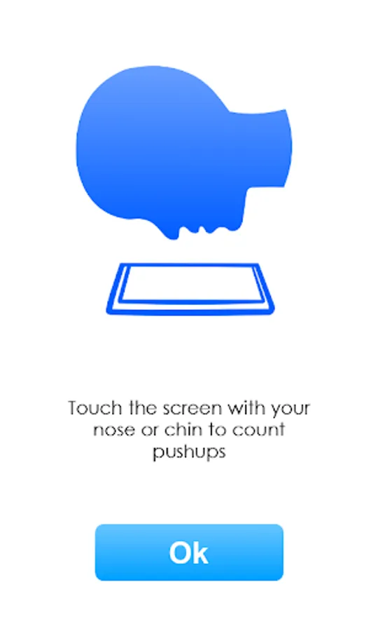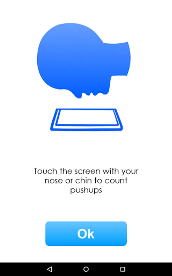 Push Up Workout helps you to count the number of push ups and recommends a training plan based on your current fitness level. You can count the pushups by touching the screen with your chin or nose. If your device supports a proximity sensor (most phones do) then physically touching the screen is not necessary. There are three different training modes: Train, Free Practice and Test. Free Practice allows you to do as many pushups as you like to without any time limits. The Test mode gives a good overview of your fitness level - you have to do as many pushups as you can in 2 minutes. In Train mode you have to do a certain number of pushups. You will also have a choice between three different levels. The number of pushups you have to do depend on your level.