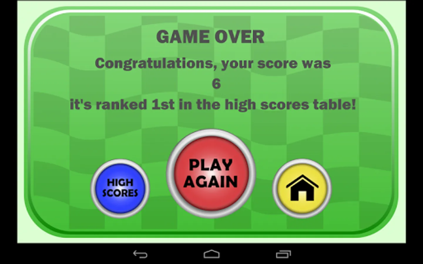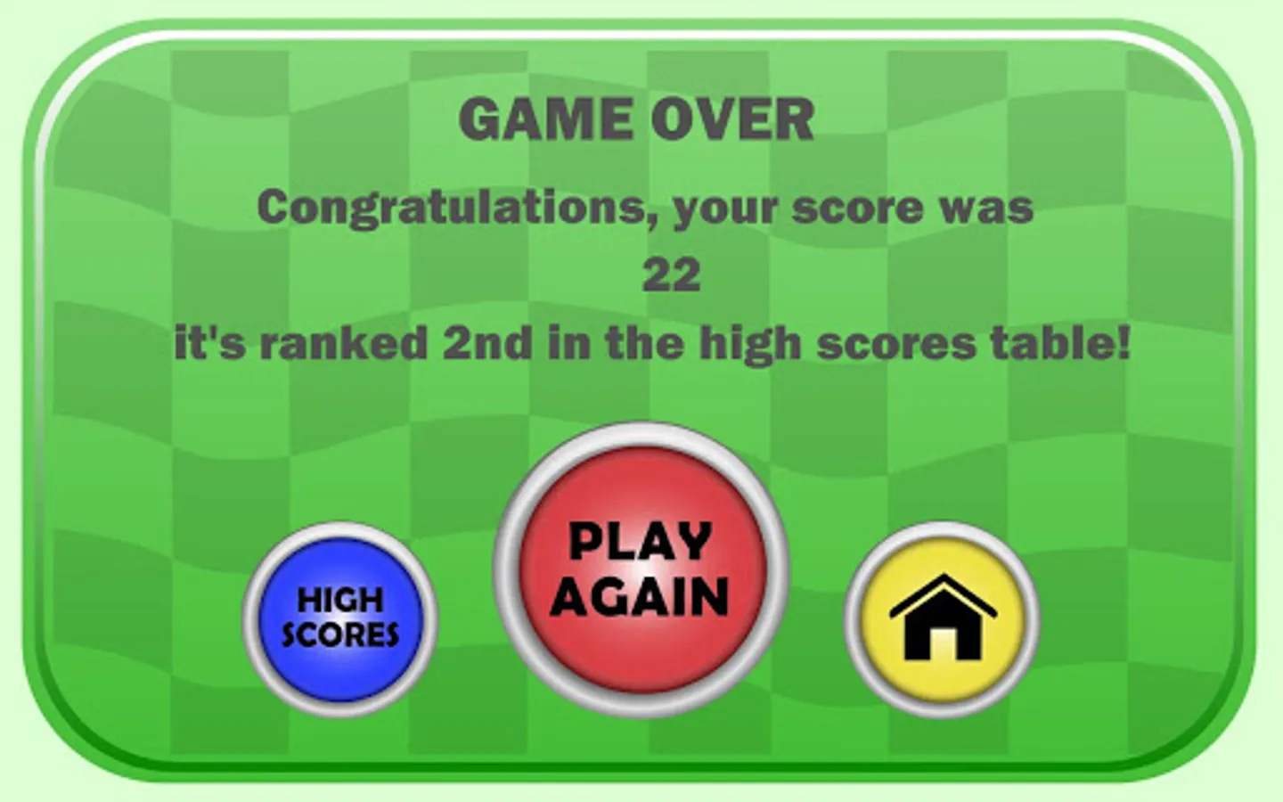 Speed Tester includes a local high scores table that saves ten best scores. Play this speed test game to find out how fast your reaction and fingers are and try to beat the best score.