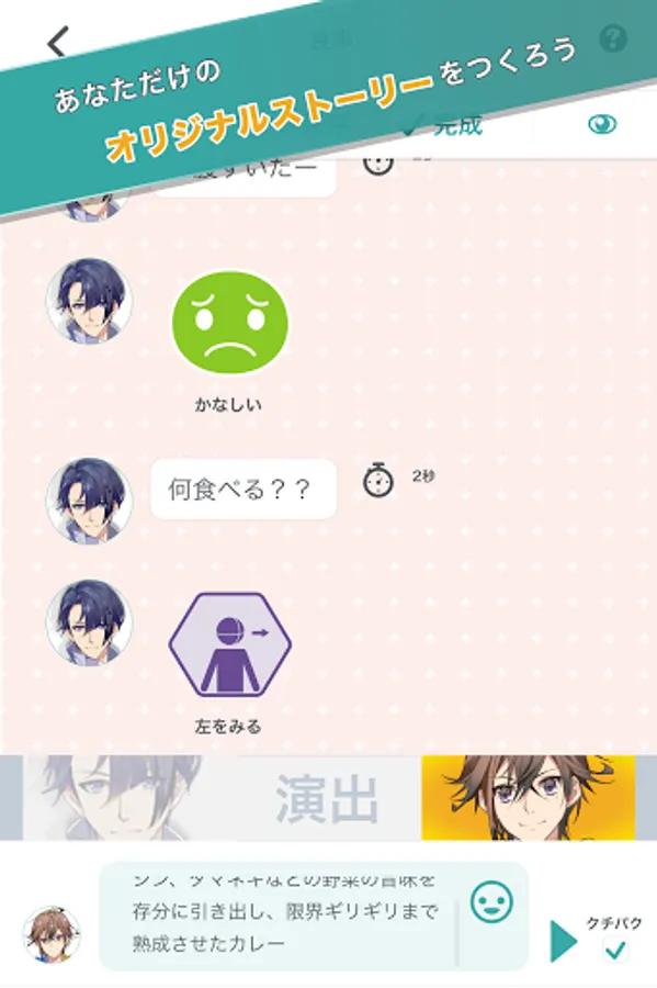 --Story creation can express a wide range of effects by combining commands (facial expressions / poses / movements / voices / effects, etc.) and lines (text).