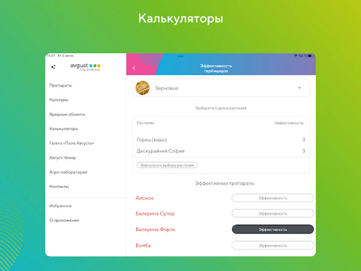 - Calculators for the effectiveness of herbicides, mixing drugs, selection of nozzles.