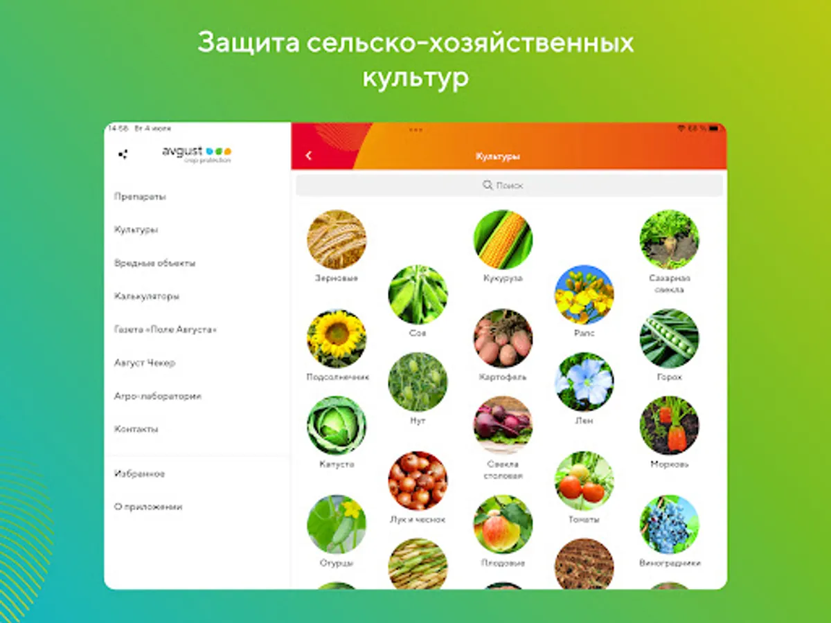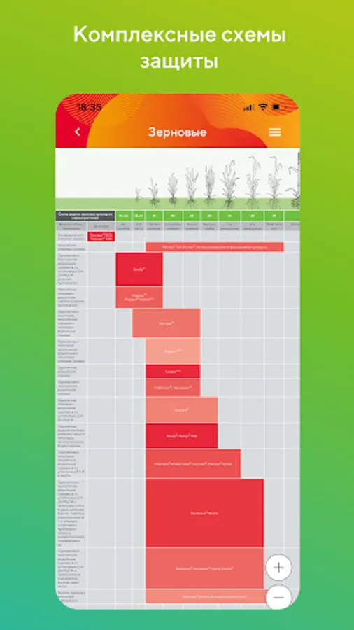 - Section "Crops" with interactive schemes for the protection of agricultural crops and a list of drugs registered on them.