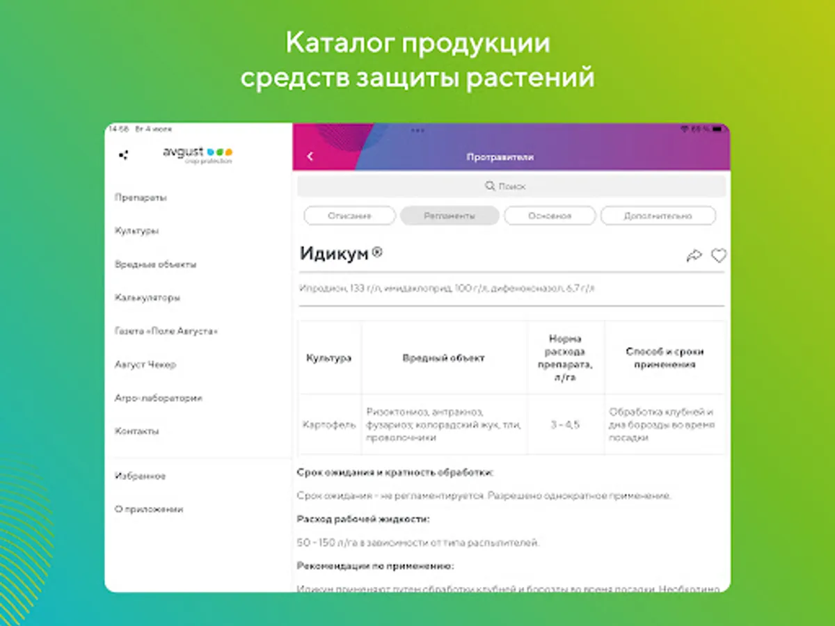 - Catalog of drugs "Augusta" with a detailed description and regulations for use. Convenient filtering is provided, which will allow you to select drugs by group, culture and active substance.
