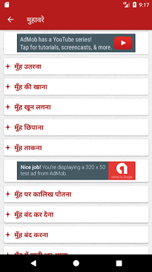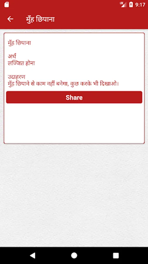 "Hindi Muhavarein" [हिन्दी मुहावरें] has a wide collection of common phrases [मुहावरे] in Hindi [हिन्दी] language. Some key features of the application include: