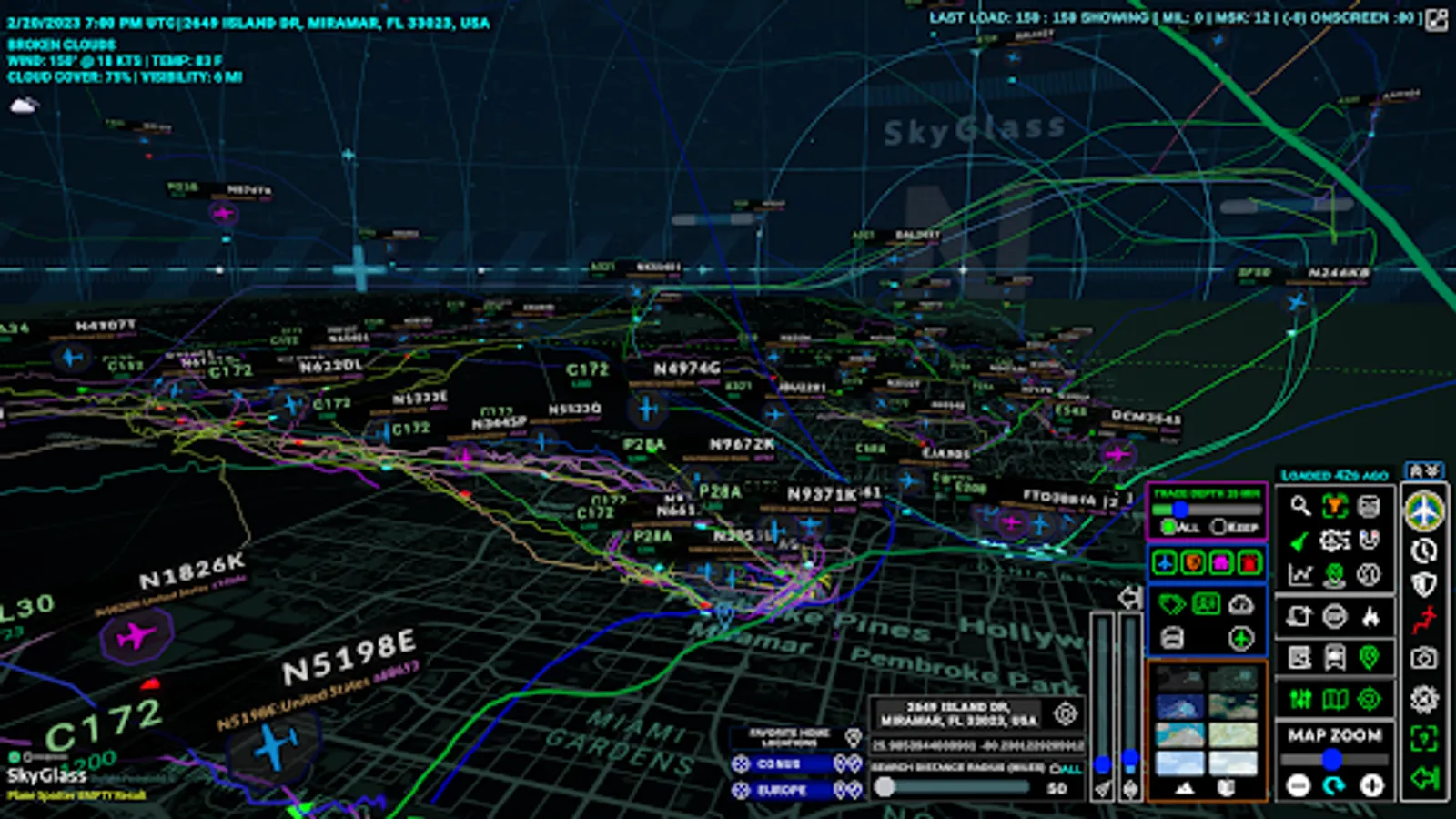 Featuring real time 3D aircraft traffic positions, 3D flight traces, historic flight data, flight history reporting, favorite aircraft watchlists, aircraft registration database, PlaneSpotter images and more using the ADSB Exchange crowdsourced network.