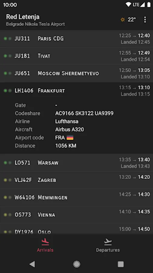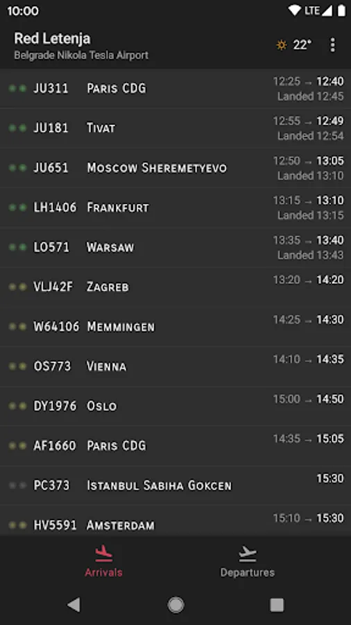Unofficial Belgrade Nikola Tesla Airport app, shows current arrivals, departures and weather.