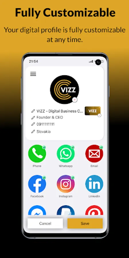 You can easily share your name, work, phone number, and address. You can use applications like Facebook, Instagram, Messenger, Linkedin, Your Website, Calendly, Google Maps, Paypal, Pinterest, Reddit, Snapchat, Tiktok, Twitter, Vimeo, Youtube, App Store, Play Store, Menu, or Custom link. If you decide you don't need to share some of them, that's fine. You turn off the function in the app.