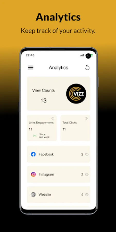 It's always good to have an overview of your activity. That's why we've developed analytics for you that will improve your insight into your client's interests. It contains the total number of visitors' views to your digital business card and clicks on each social media icon.