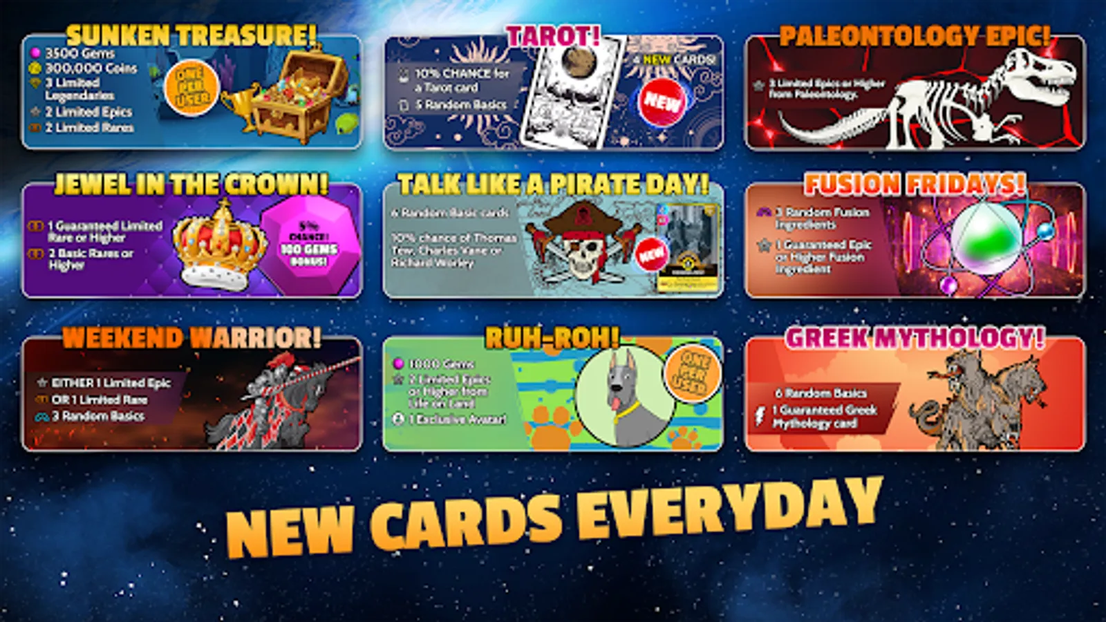 - Play daily to earn FREE unique rewards & build your CUE card collection