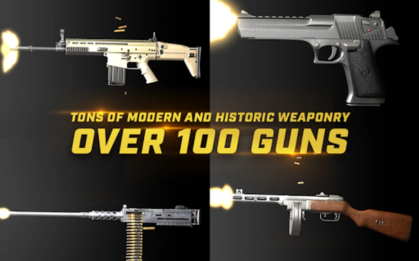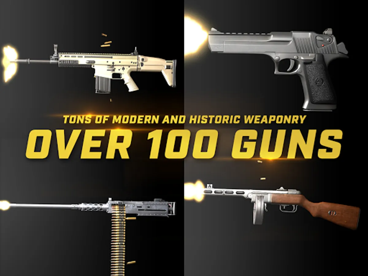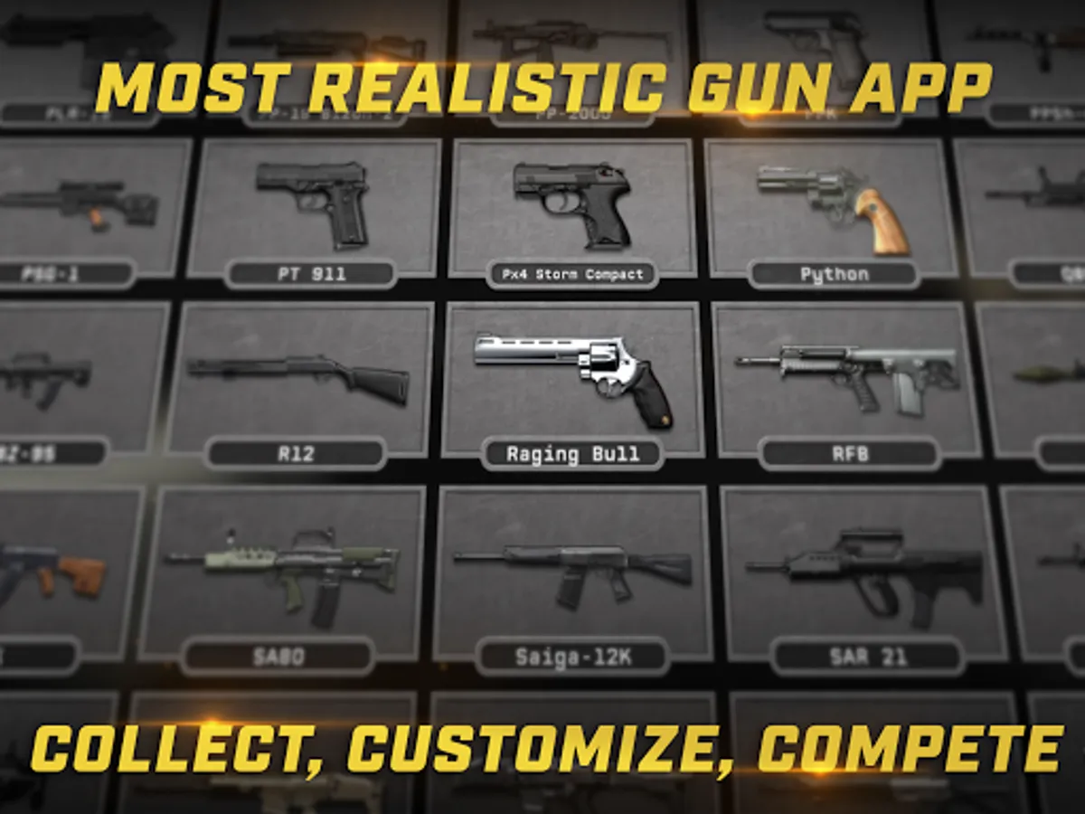 The app has an ever growing collection of guns witch includes, rifles, pistols, handguns, machine guns, pdw, and will soon feature revolvers and rocket launchers as well.