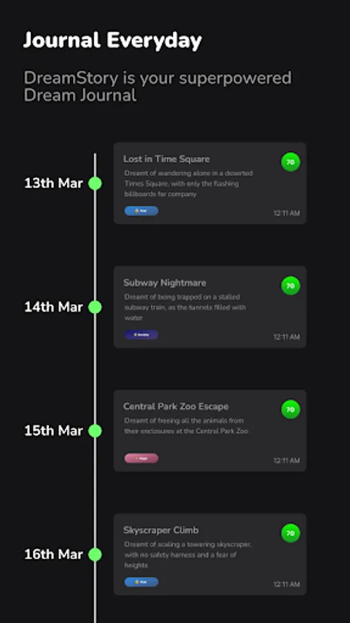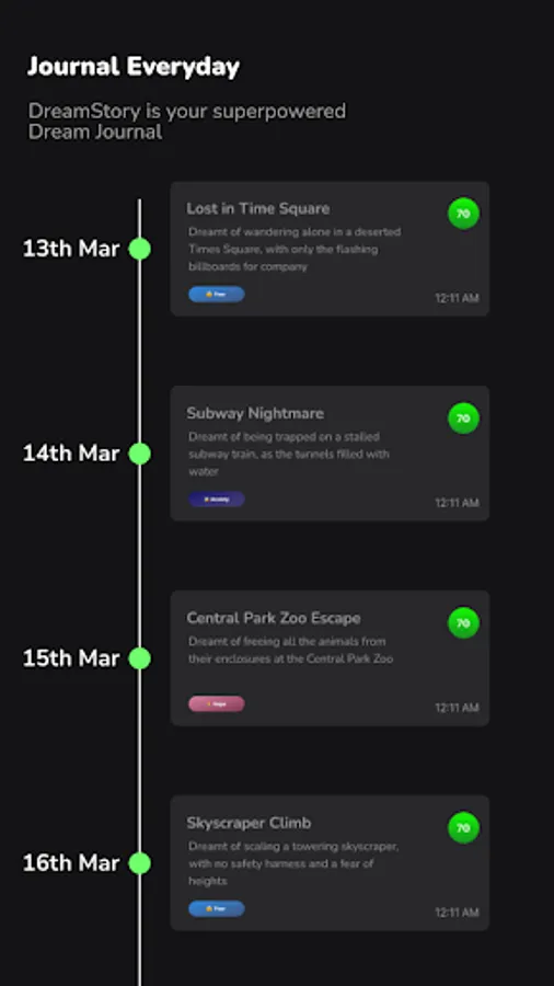 With DreamStory, you can maintain a dream journal daily and see how your dreams affect your overall well-being. Our AI engine scores your dreams based on their themes, symbols, and meanings, and displays a graph of your progress over time. You can also see which themes and symbols are recurring in your dreams, helping you understand your subconscious thoughts and feelings better.