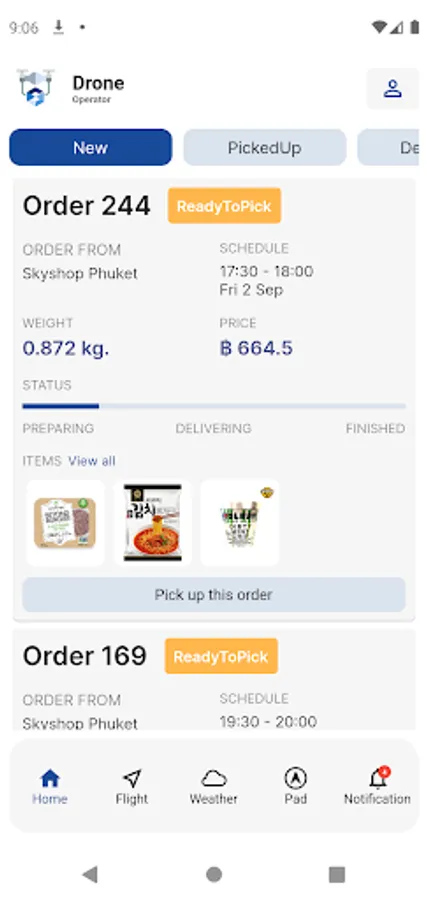 Drone operator is application for drone flying agent to pick an order from customer that order from Skyshop application and deliver them with drone.