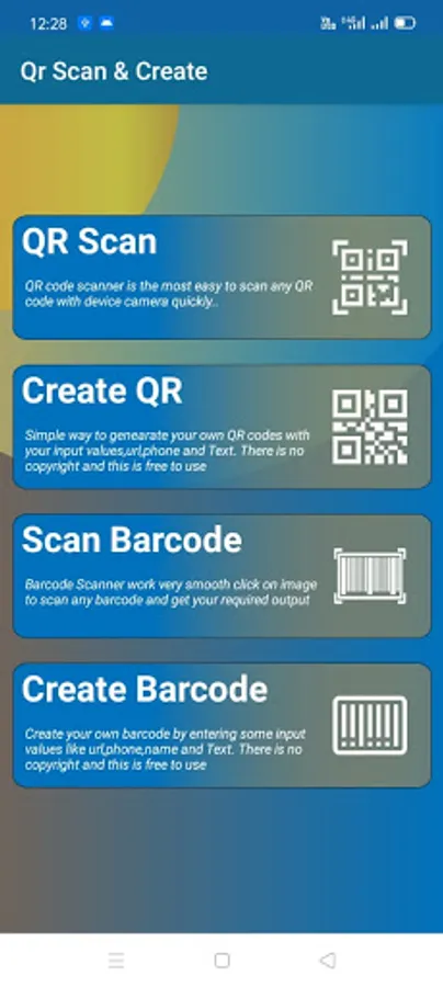 In this app you can be create your own QR codes and Barcodes which is free to use any where this app has simple user interface so that it is easy to use