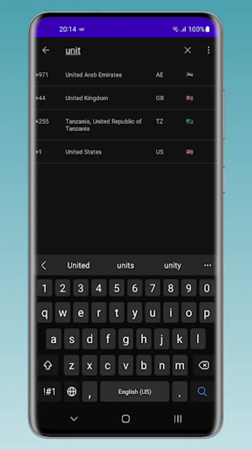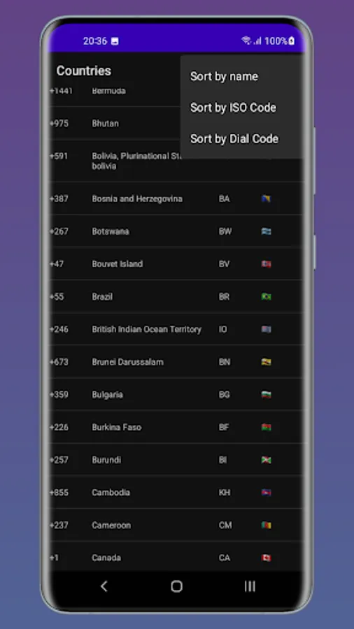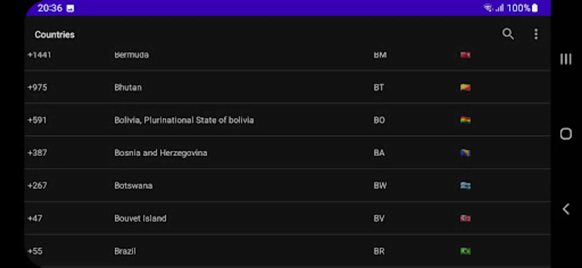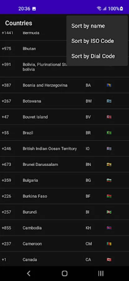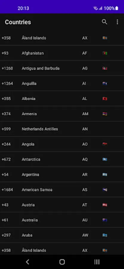 The app features an easy-to-use interface, with countries listed in alphabetical order for quick reference. Simply select the country you're interested in and you'll be presented with its flag emoji, ISO code, and dialing code.