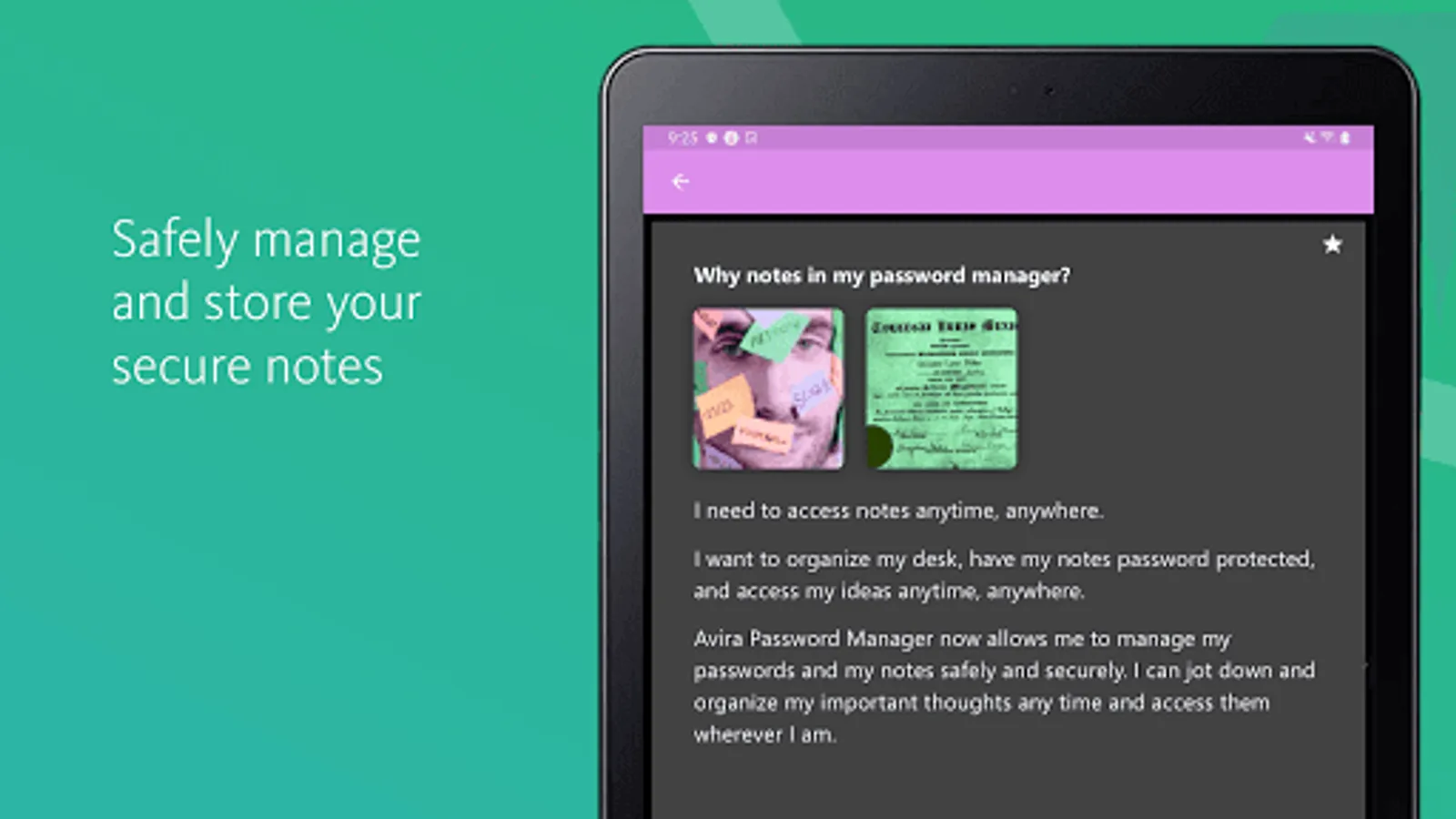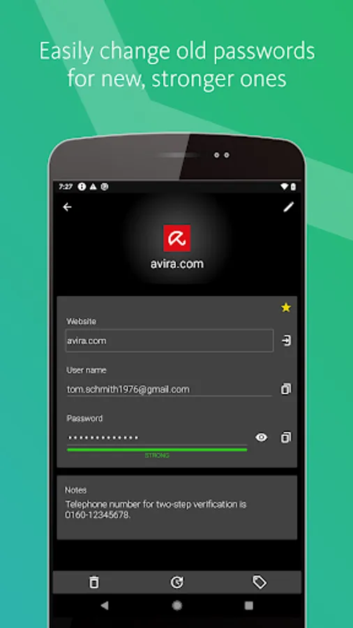 Your passwords, credit cards, and notes are protected using 256-bit AES encryption – the most secure standard out there. Think of it as your own personal armoured password safe. Thanks to your master password only you and you alone have access to them – not even Avira can access your data. For extra security you can use your fingerprint authentication on Google devices.