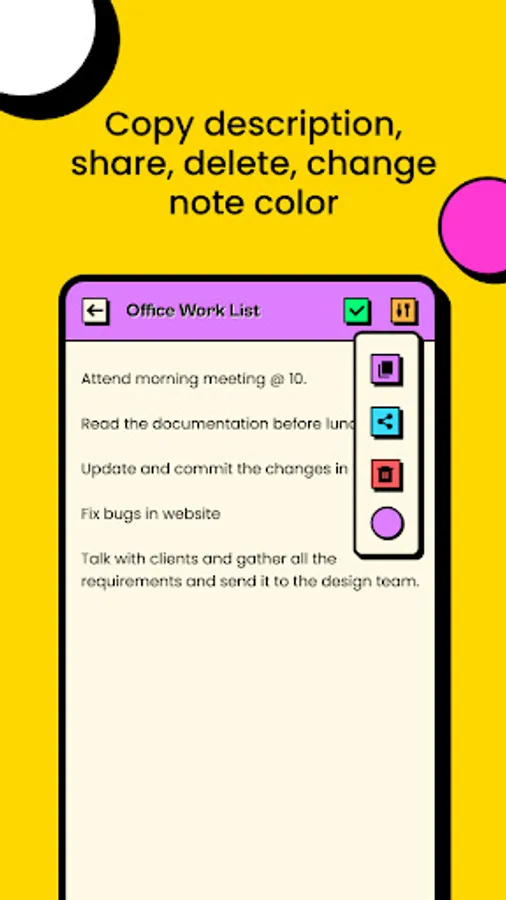 🟡 One of the key features of our app is the ability to change the color of each note. This is a great way to visually organize your notes, making it easy to find the ones you need quickly. You can choose from a range of colors that works for you.