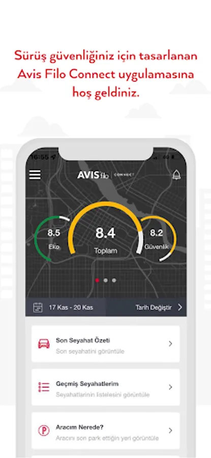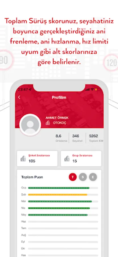 You can easily access your past trips, safe driving scores and your company ranking in the league table from the application.