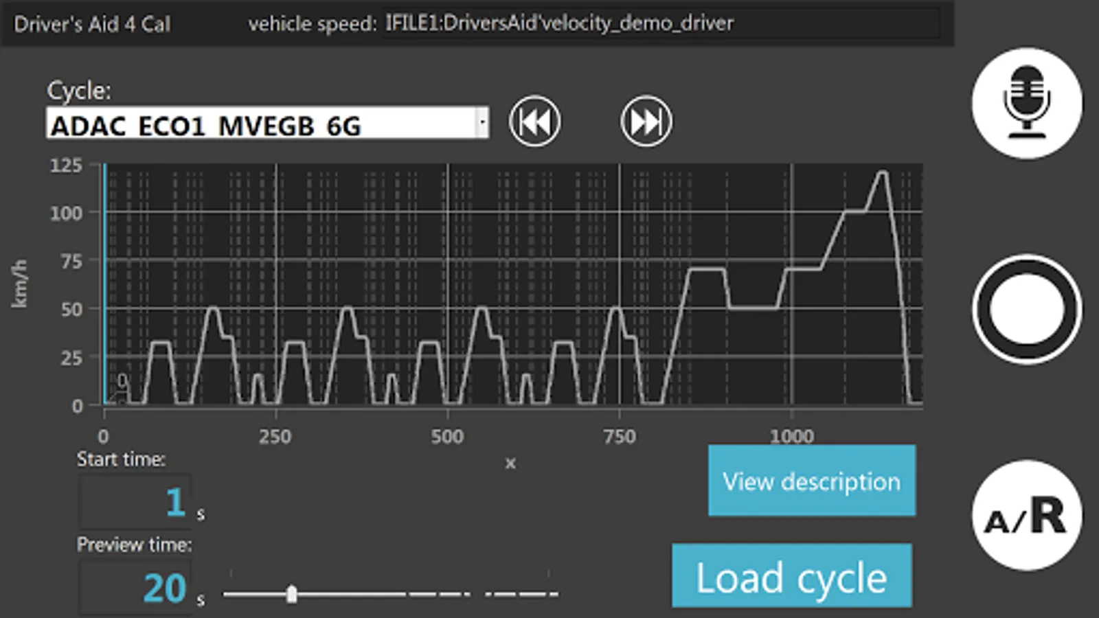 The Drivers Aid Application is a stand-alone application to guide a driver through test cycles (pre-configured or custom specific) by graphically displaying the specifications of the driving test procedure.