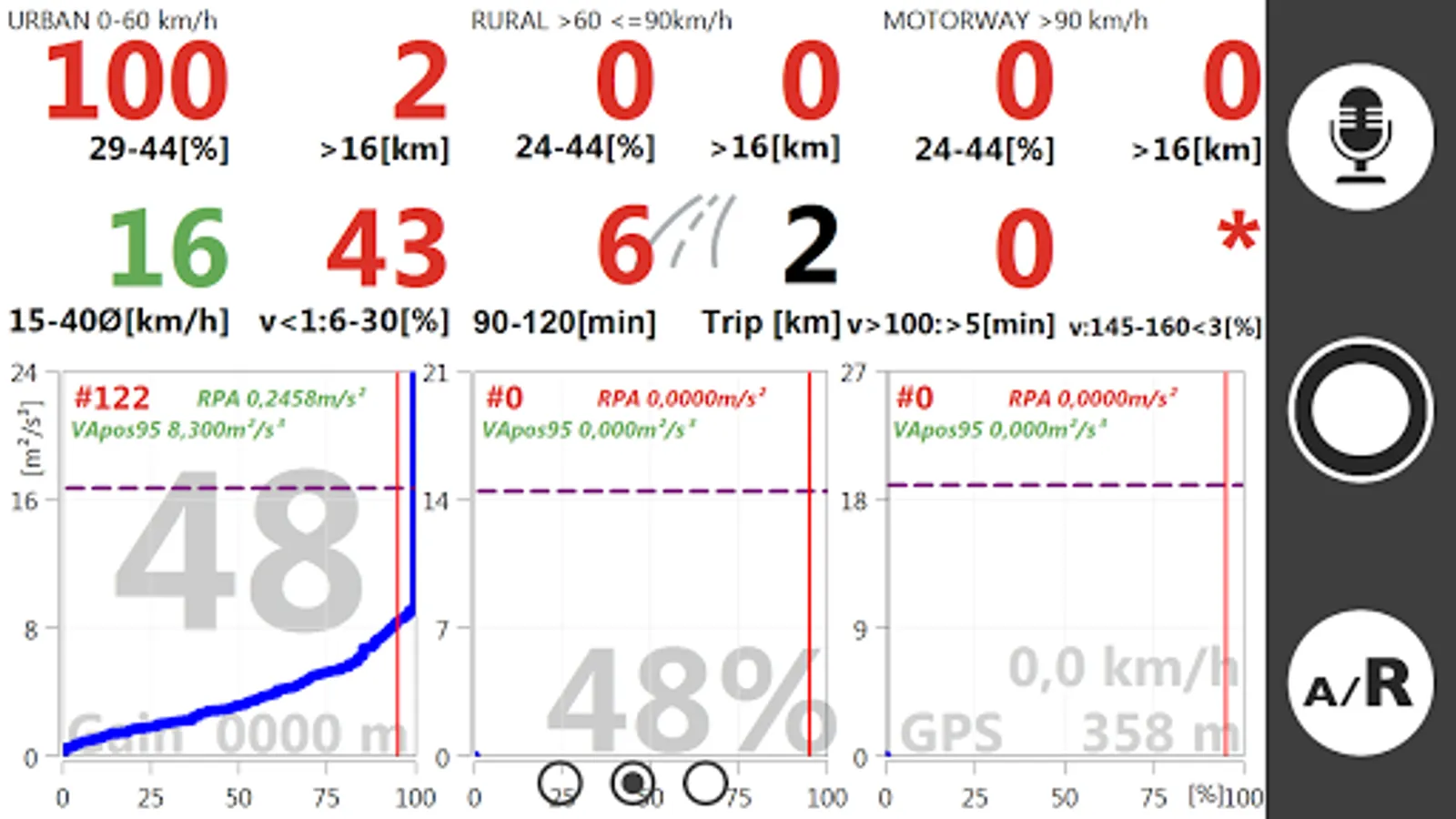 The application provides the driver with a graphical display of the current status for the driver criteria (urban, rural and motorway), such as driven distance, trip shares, test duration, dynamic behaviour and average speed.