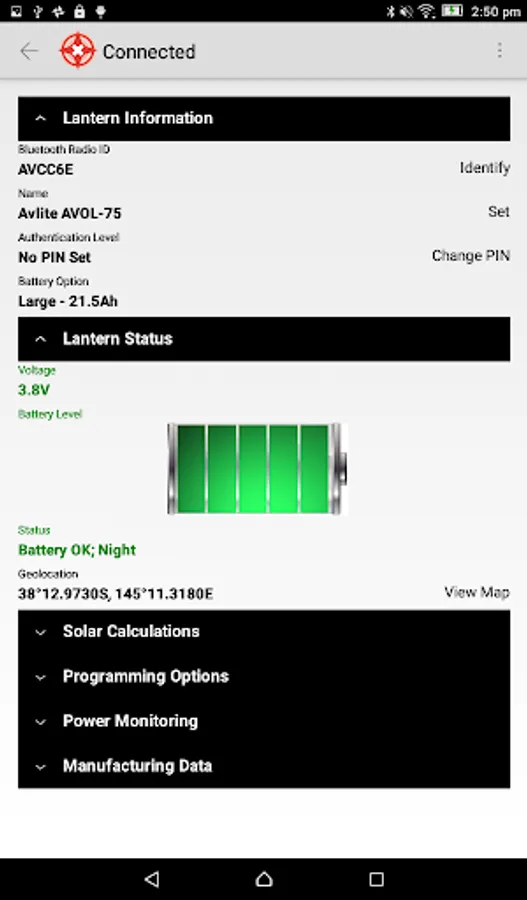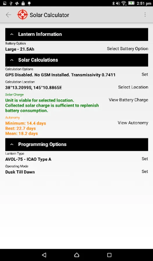 Plus using the in-built Avlite Solar Calculator, you can verify the light’s ability to operate in a set location using the device GPS co-ordinates or manually select a global location from anywhere in the world. The solar calculator will determine the average sunlight hours for the given location, power requirements and provide a result to the user on suitability.
