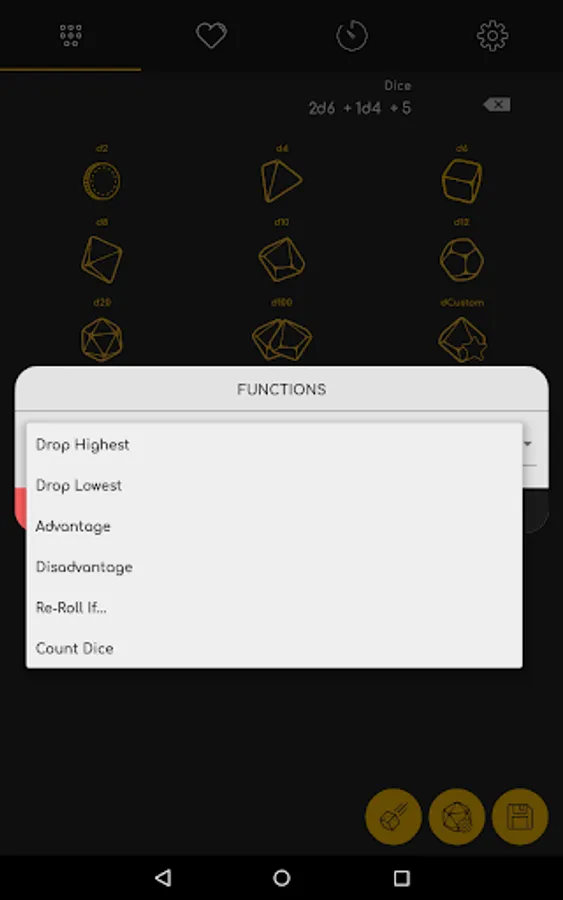 Add special functionality to your dice like "Re-roll if...", "Advantage/Disadvantage" or "Drop highest" and more other.