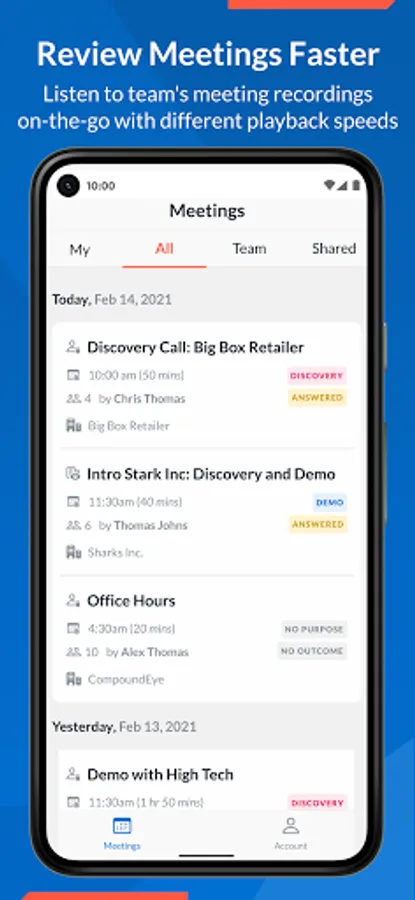 Access all your meeting and call recordings from Avoma with the Avoma Android app.