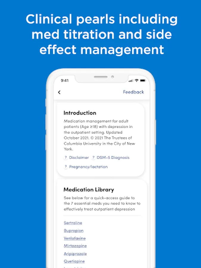 The app incorporates Columbia’s Accelerated Sequential Antidepressant Protocol (ASAP) © 2021 The Trustees of Columbia University in the City of New York. Complete with calculators to assess depression severity (PHQ-9 and Columbia Depression Scale), bipolar screening, and suicide risk assessment, this app puts all the information needed to treat depression at your fingertips. Also included are clinical pearls, such as how to titrate antidepressants and manage common side effects.