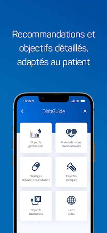 Based on the latest publications of French, European and American learned societies, DiabGuide offers objectives and treatments adapted to your patients. No more maze of recommendations, DiabGuide takes care of everything.