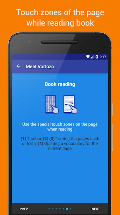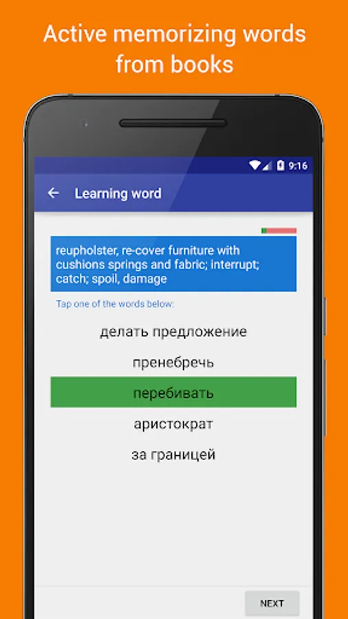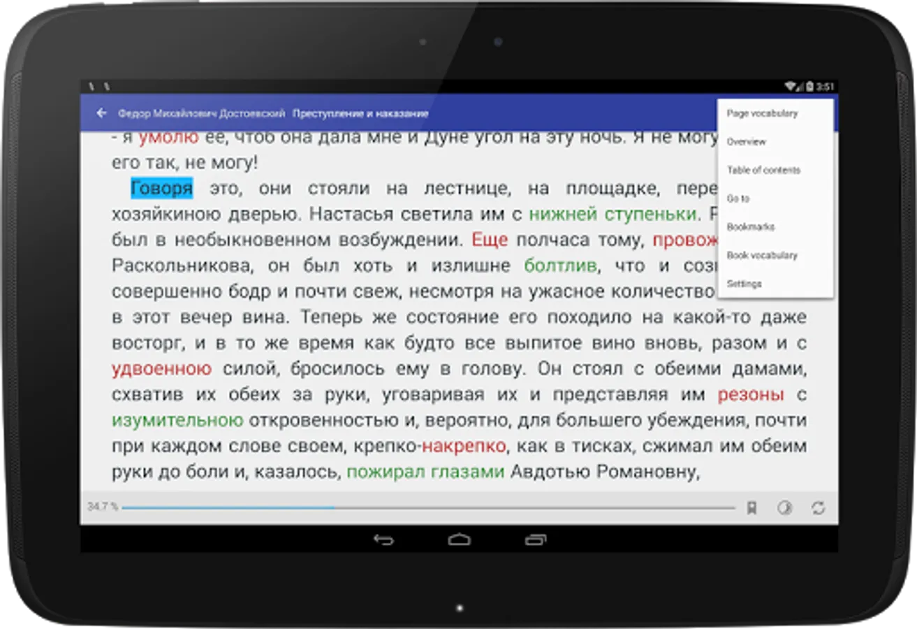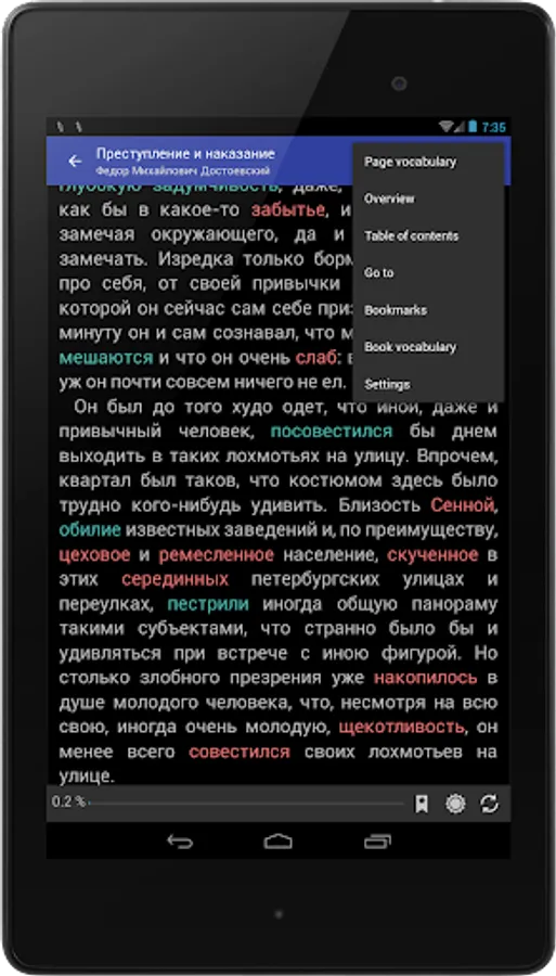 When reading, if the book is in foreign language, the app highlights unknown words and builds a dictionary for the current page to explore and learn these words. Also it offers for learners a special active memorization procedure for the unknown words and phrases from the reading books.