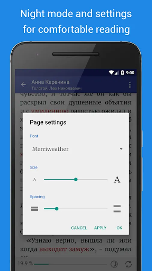 - Provides comfortable reading with using dark and light color themes, settings for font, changing text contrast