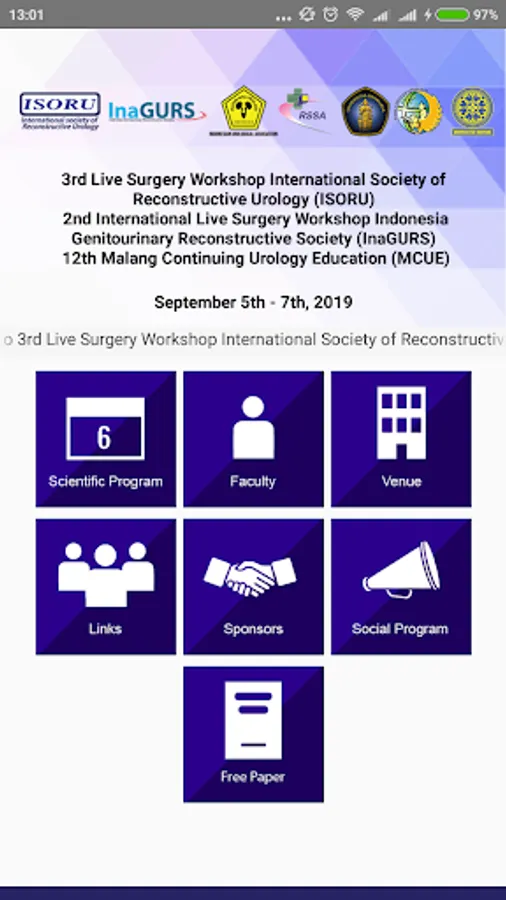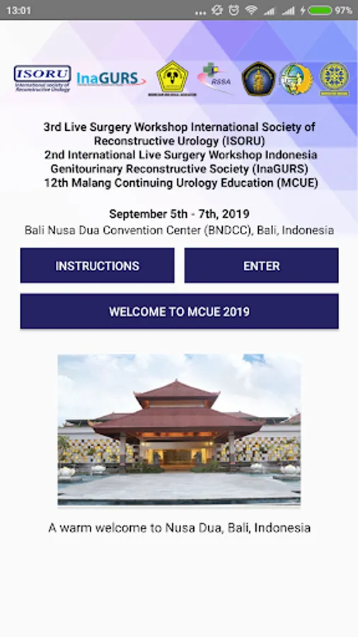 This is the new delegate app for The 3rd Live Surgery Workshop International Society of Reconstructive Urology (ISORU), 2nd International Live Surgery Workshop Indonesia Genitourinary Reconstructive Society (InaGURS), 12th Malang Continuing Urology Education (MCUE). This meeting will be held TBali Nusa Dua Convention Center (BNDCC), Bali, Indonesia, from September 5th to 7th, 2019