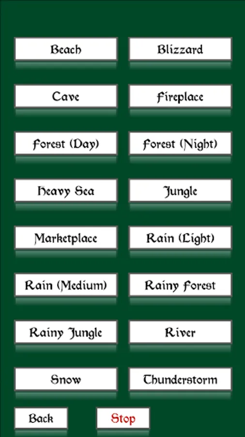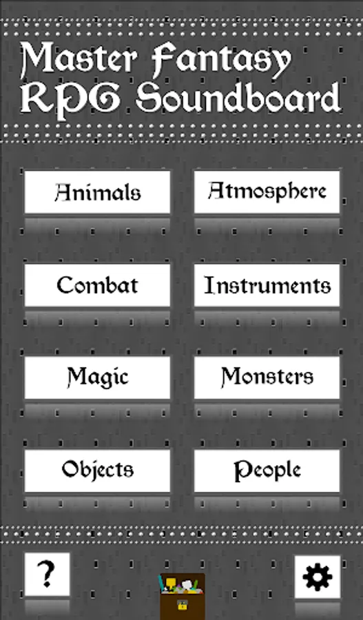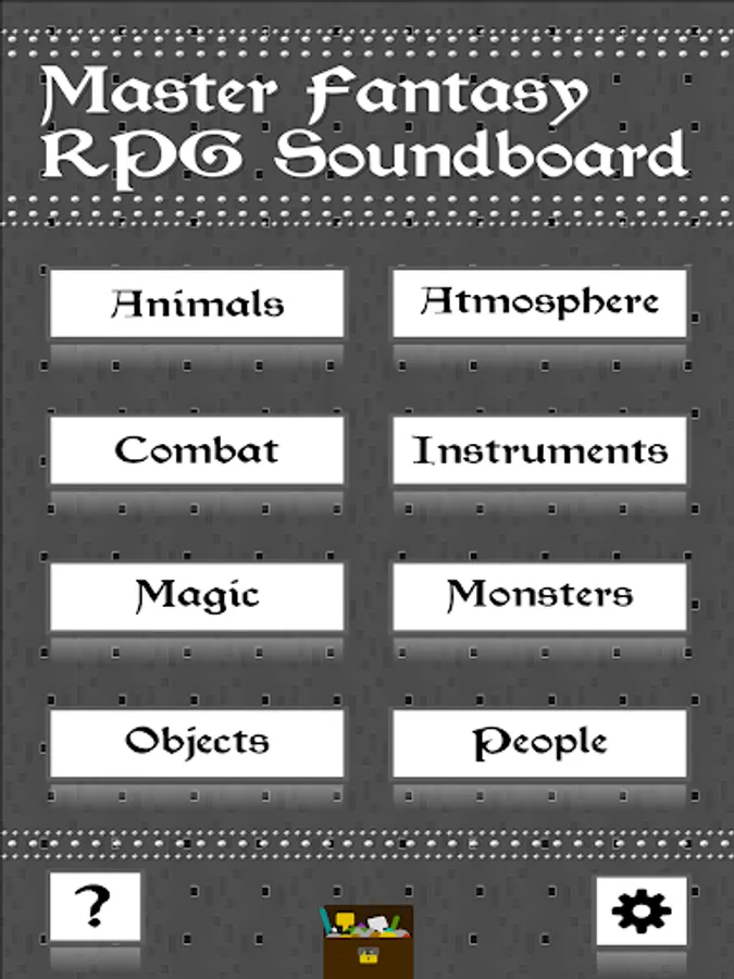 After the initial startup load all of the great RPG sounds are at your fingertips for instant playability without the need to load any sounds before playing. No lagging and no ads. This app can easily enhance the roleplaying atmosphere during board game time at day or night. While on the main menu you can pick the category you want and quickly pull up those sounds and go back to the other categories just as quick as well. The 8 sound categories in this app are Animals, Atmosphere, Combat, Instruments, Magic, Monsters, Objects, and People. Atmosphere audio can play in the background while you play other sound effects.