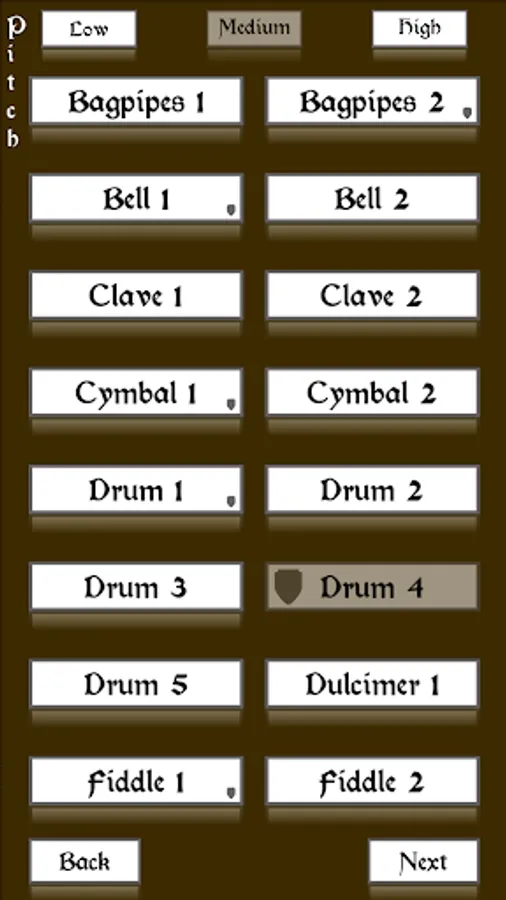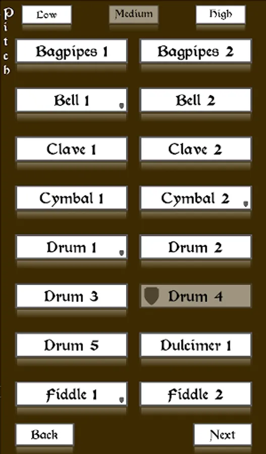 Instruments: bagpipes, cymbal, drums, fiddles, flutes, harps, horns, and more