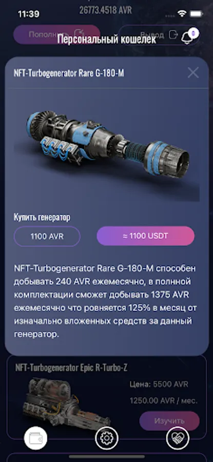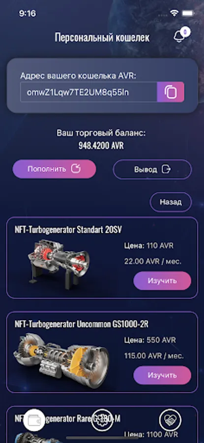 The application displays information about the current balance in Aurora tokens and also transfer tokens to another user.