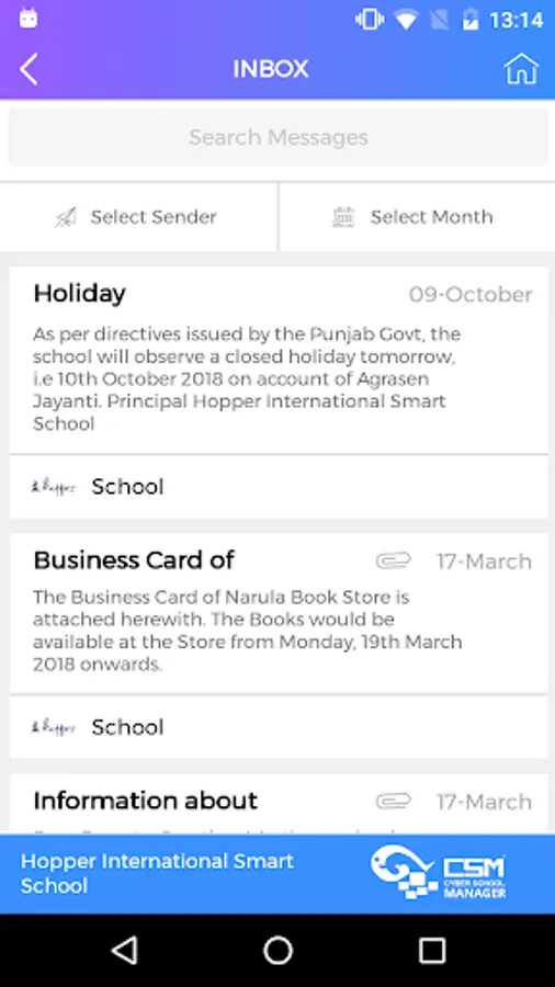 Daily Class Work and Home Work is updated on the App so that parents needs not to rely on the conventional- old fashion school diary mode. Special Message on some special topic can be sent to Individual Parent.