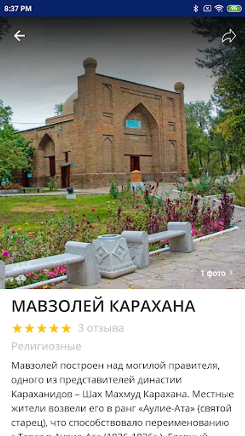 Taraz Tour is a unique mobile application that includes a large amount of functionality for popularizing historical, cultural and tourist places of the region. To date, 20 objects of Zhambyl region have been digitized in the application, in the plans of the project to digitize all historical, cultural and tourist objects of the region. Thus, with the help of this application, we would like to increase the interest in understanding the history of the region for domestic and inbound tourism. The mobile application consists of audio and textual information in 5 languages, with elements of augmented reality, which allows tourists to get information in their convenient interpretation. In addition, the location is hammered into the base, the route how to get to this place. Users can leave comments that will help keep track of the interests of tourists for further development. The application itself consists of five important components.