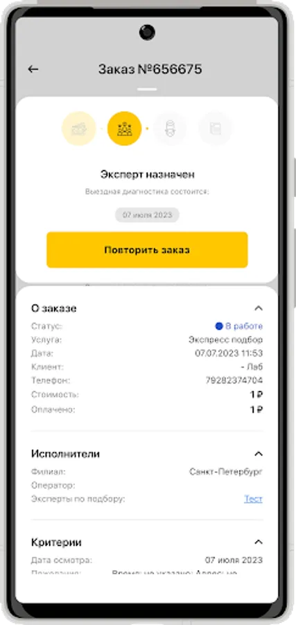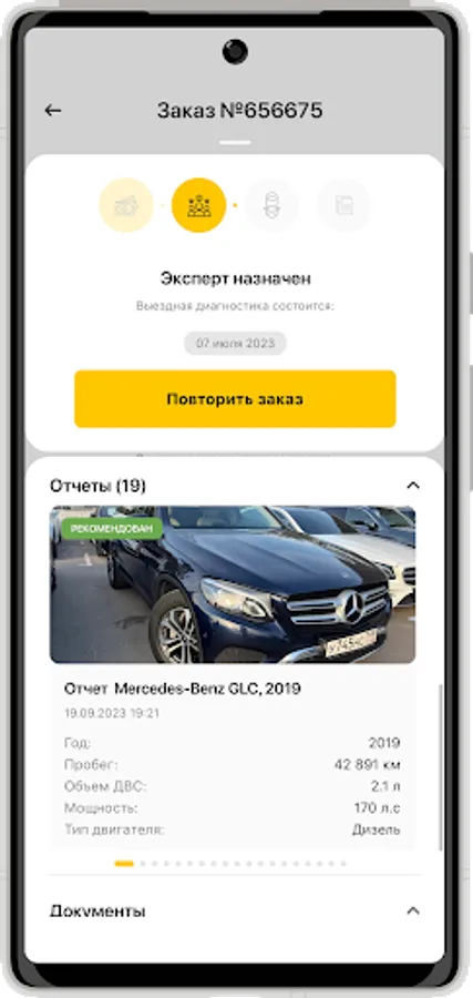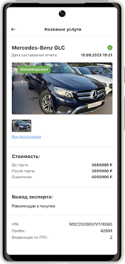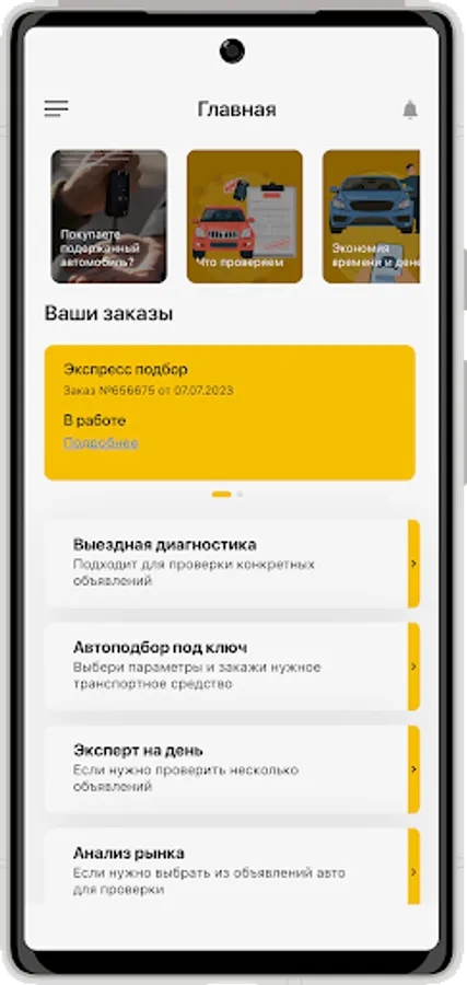 The Auto-selection.rf application provides detailed reports on inspected cars, an appointment for a car inspection, turnkey selection, an expert for the day, and market analysis.