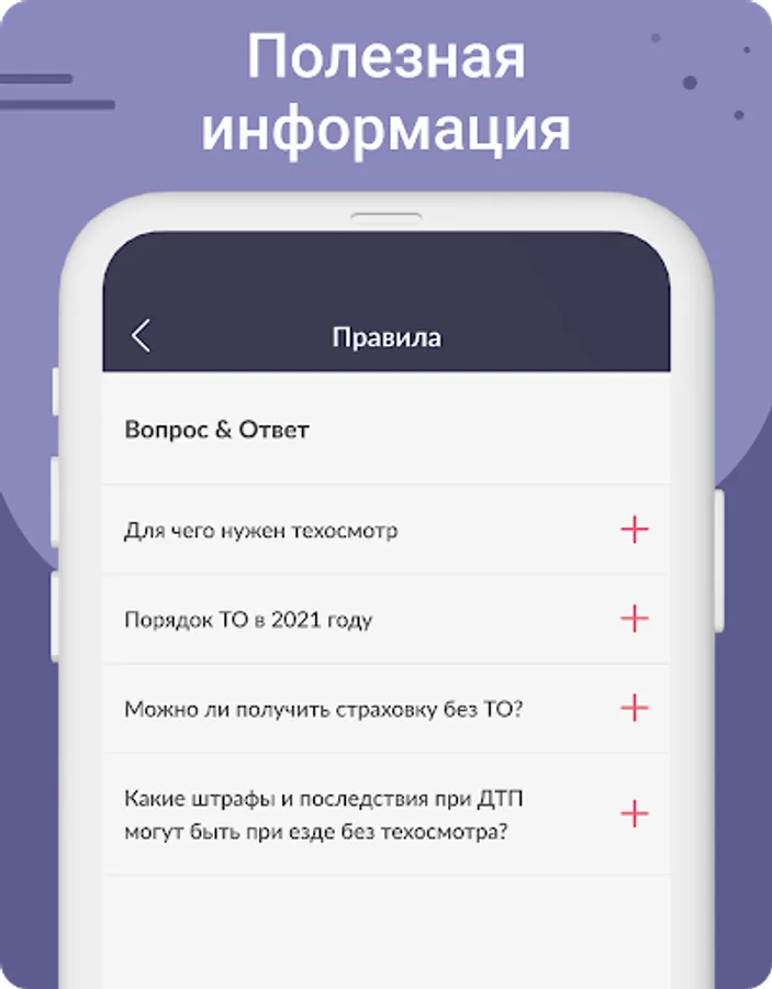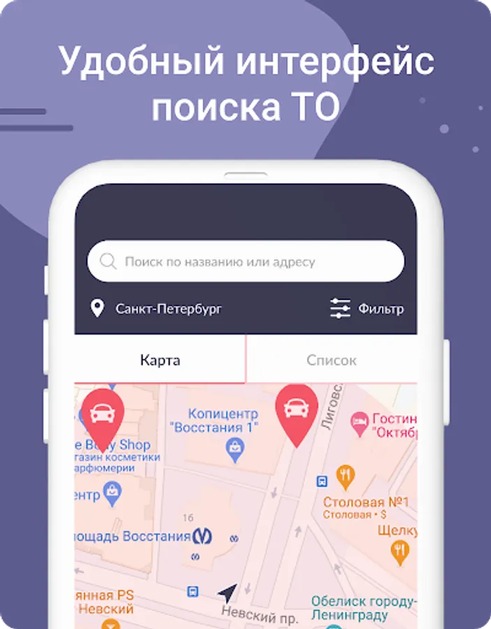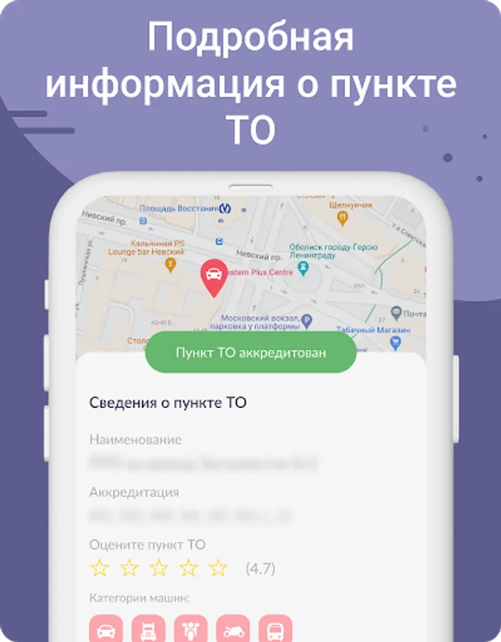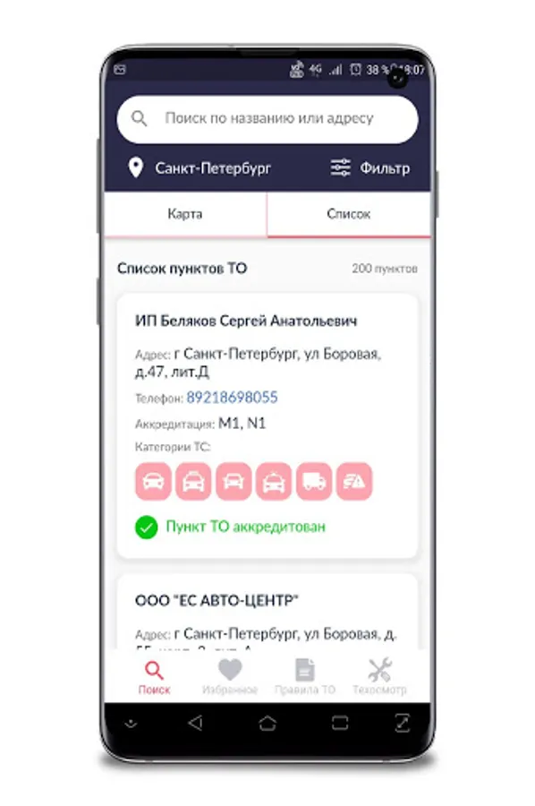 The application will help you choose the point where you can pass the inspection. For convenience, the accredited companies are marked on the map. You can get acquainted with the detailed information on each item: name, address, scope of accreditation and read reviews about the company. Using the application, you can select a maintenance item based on certain criteria, for example, based on location.