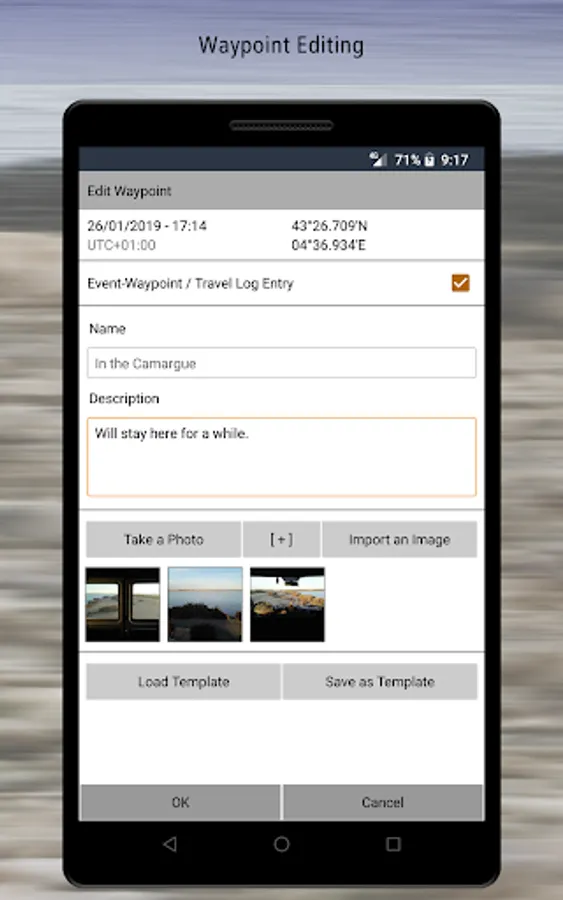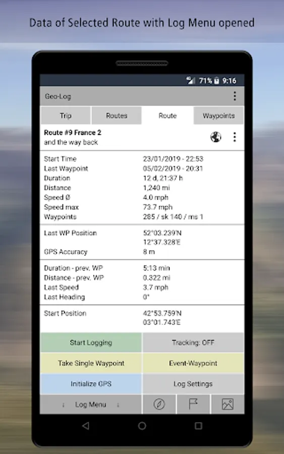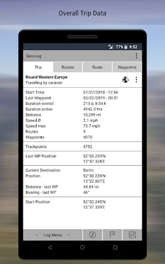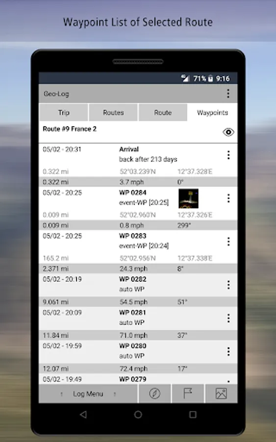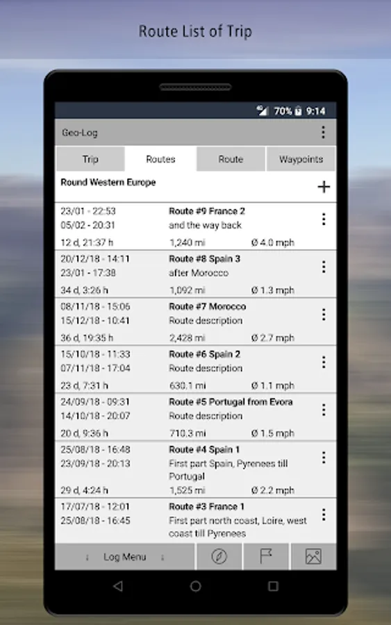 ➤ An editable waypoint-list for each route of your trip lets you create a detailed diary of your complete journey. Geo-Log will allow you to enter text or shoot photos in-app as well as import them at a later time. Many different options are available for convenient storage of trips, routes and journals.