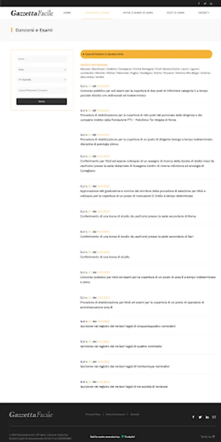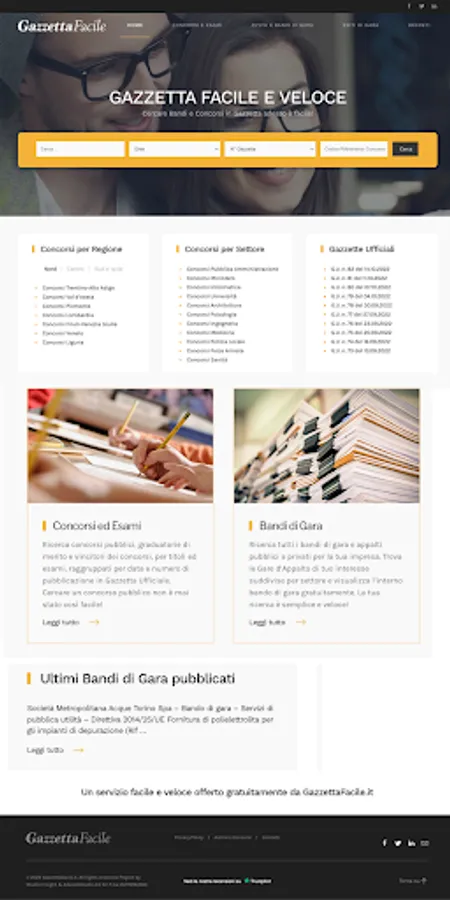 With Gazzetta Facile you can perform quick and easy searches on Calls and Competitions, Rankings, Calls for tenders and public or private tenders that are published weekly in the Official Gazette.