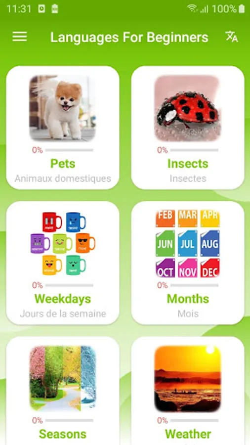 Languages For Beginners help Beginners get more confident in speaking and listening to Languages. Kids and Beginners will learn Languages by play interactive games by good topics and real life, easy and fun to learn vocabulary through pictures.
