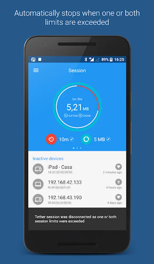 ★ Automatically stop shared data connection when one of the limits (data, time or battery level) is reached.